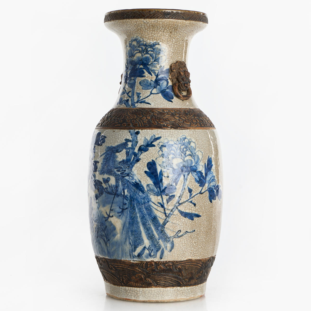 Glaserad i brunt och blått, på ställ i trä.