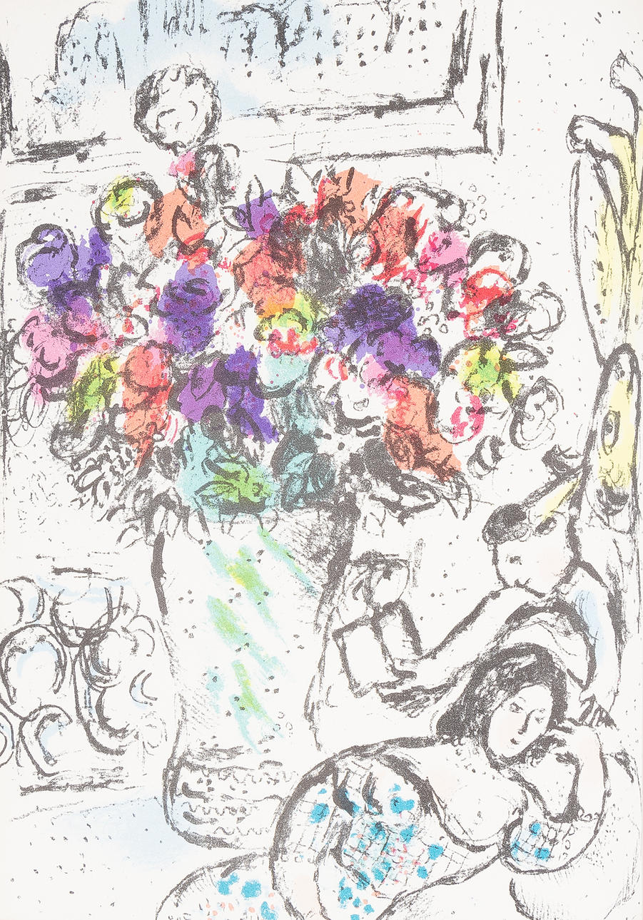 Fransk edition. Fernand Mourlot. Éditeur André Sauret, 1974. 2 originallitografier av Marc Chagall, i färg, omslaget och en frontespis. Transparent skyddsomslag, kassett i kartong. Fjärde delen av 6.
