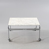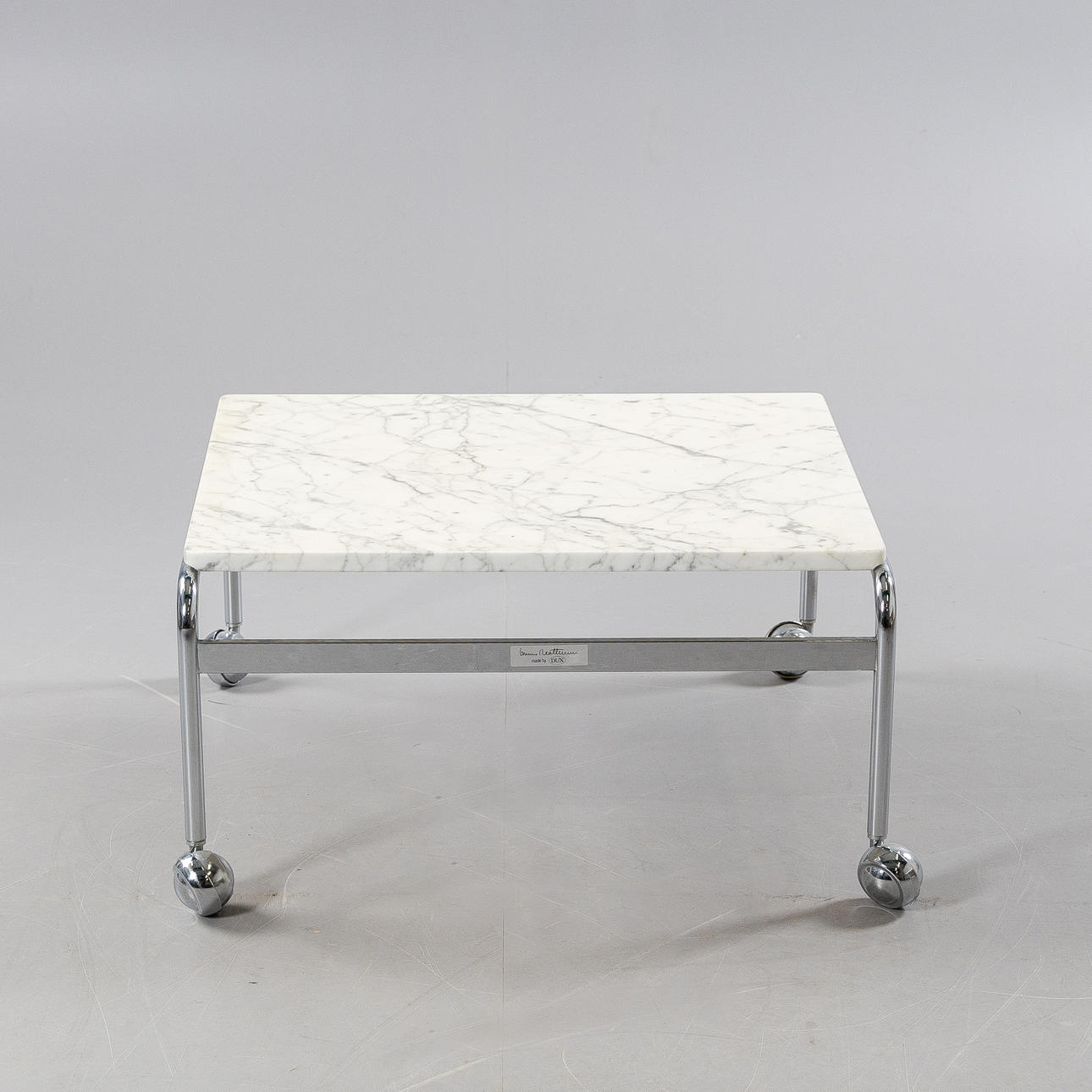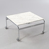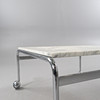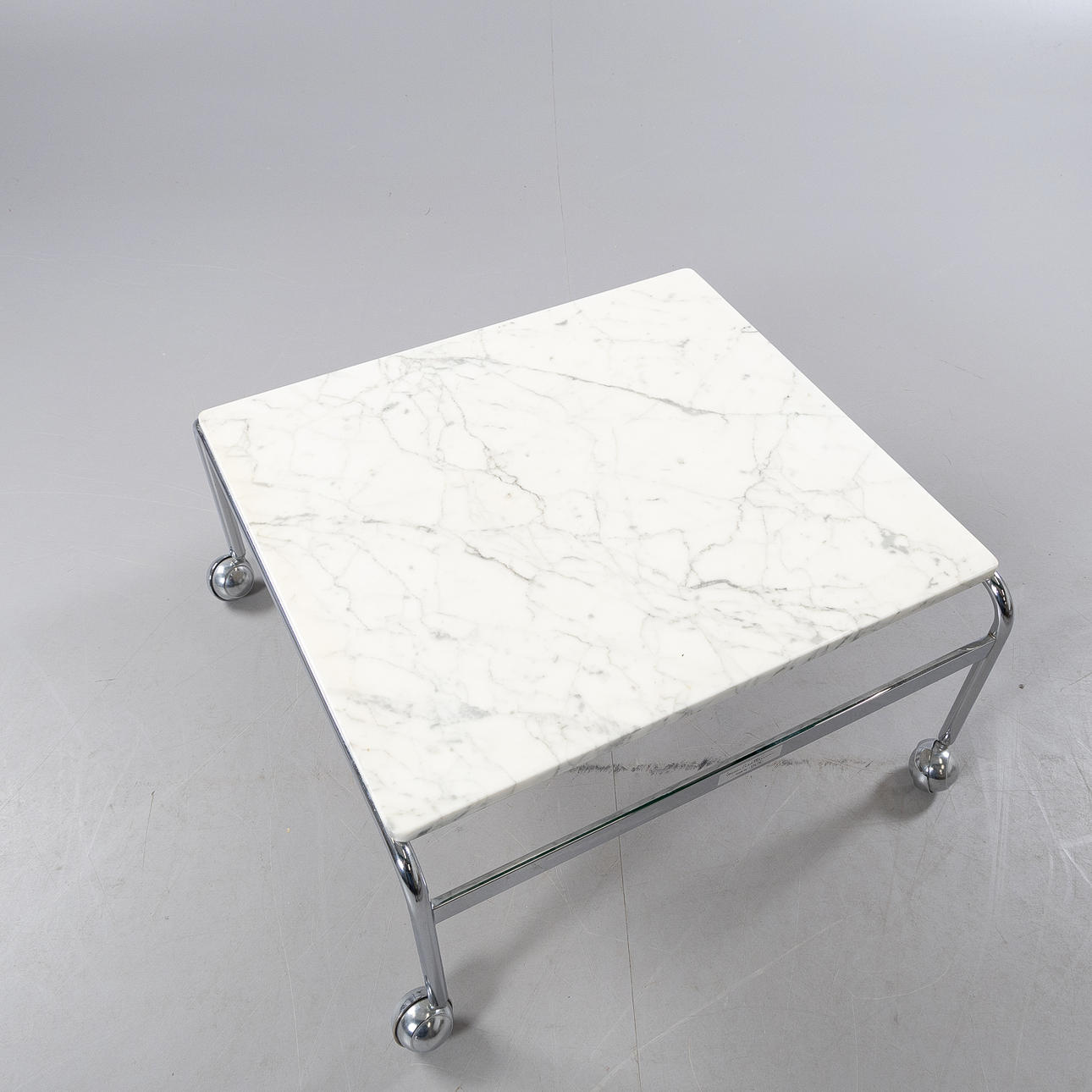 Marmorskiva, kromat underrede med hjul, etikettmärkt, höjd ca 33, 65x65 cm.