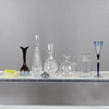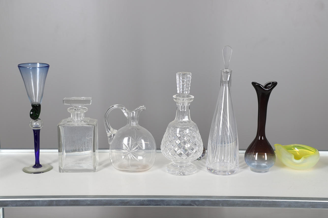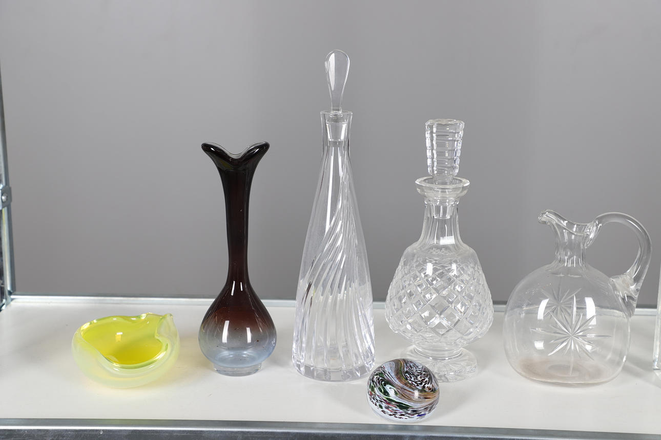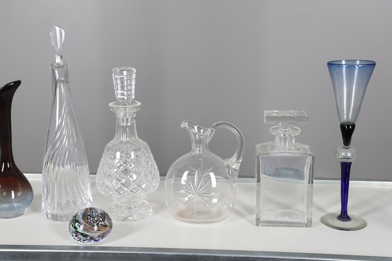 Ett blandat parti inklusive en smal glaskaraff med räfflad kropp (38 cm hög) och två andra karaffer (31 cm och 22 cm höga), även med andra glasföremål och en pappersvikt.