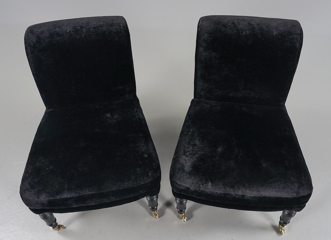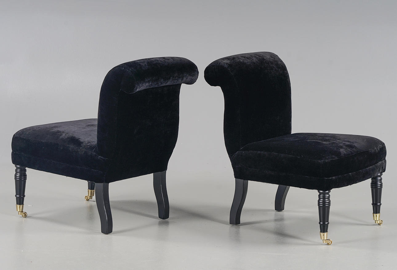 Klädda med svart plysch, ben i svärtat trä. Hjultrissor i mässing framtill.