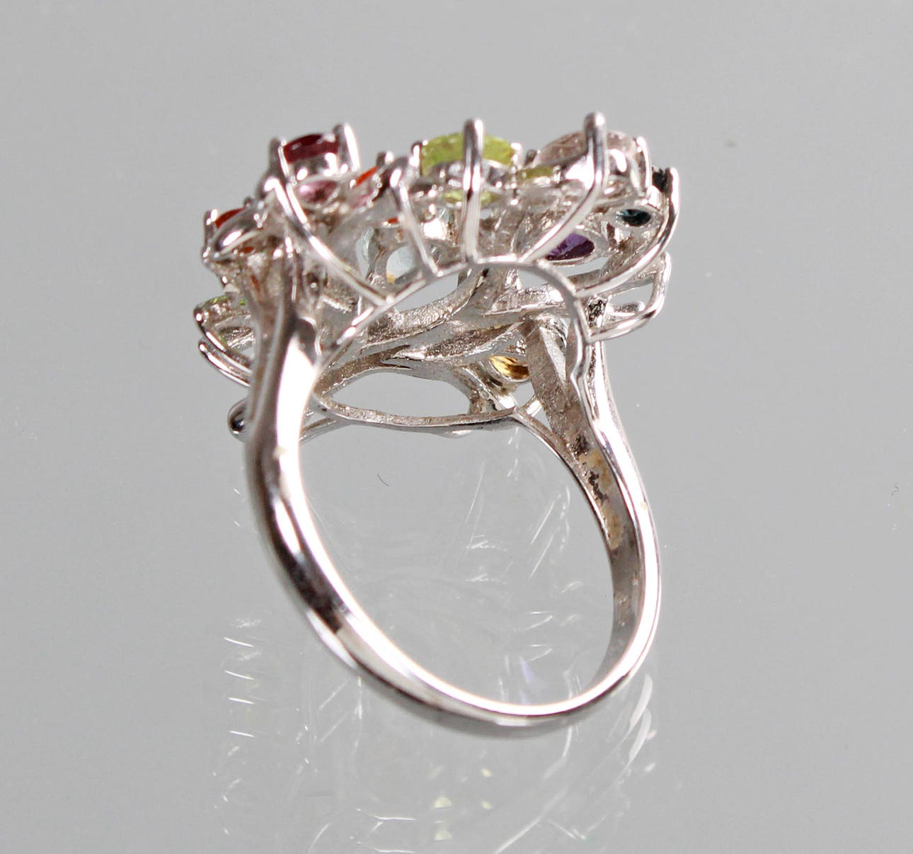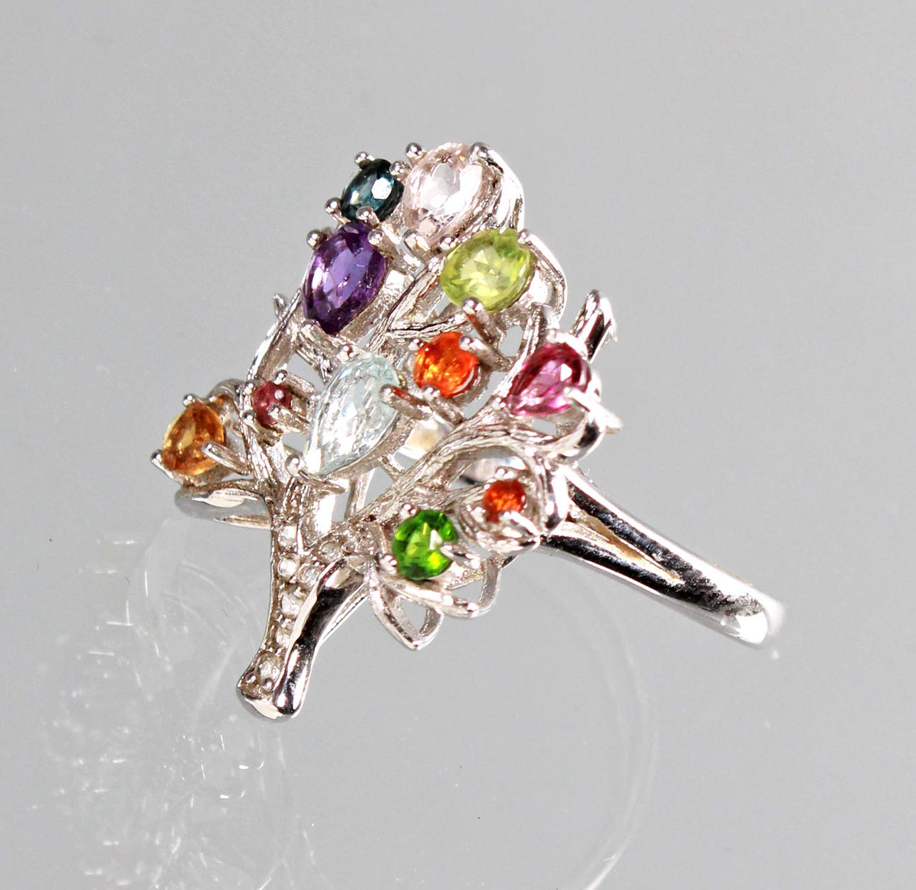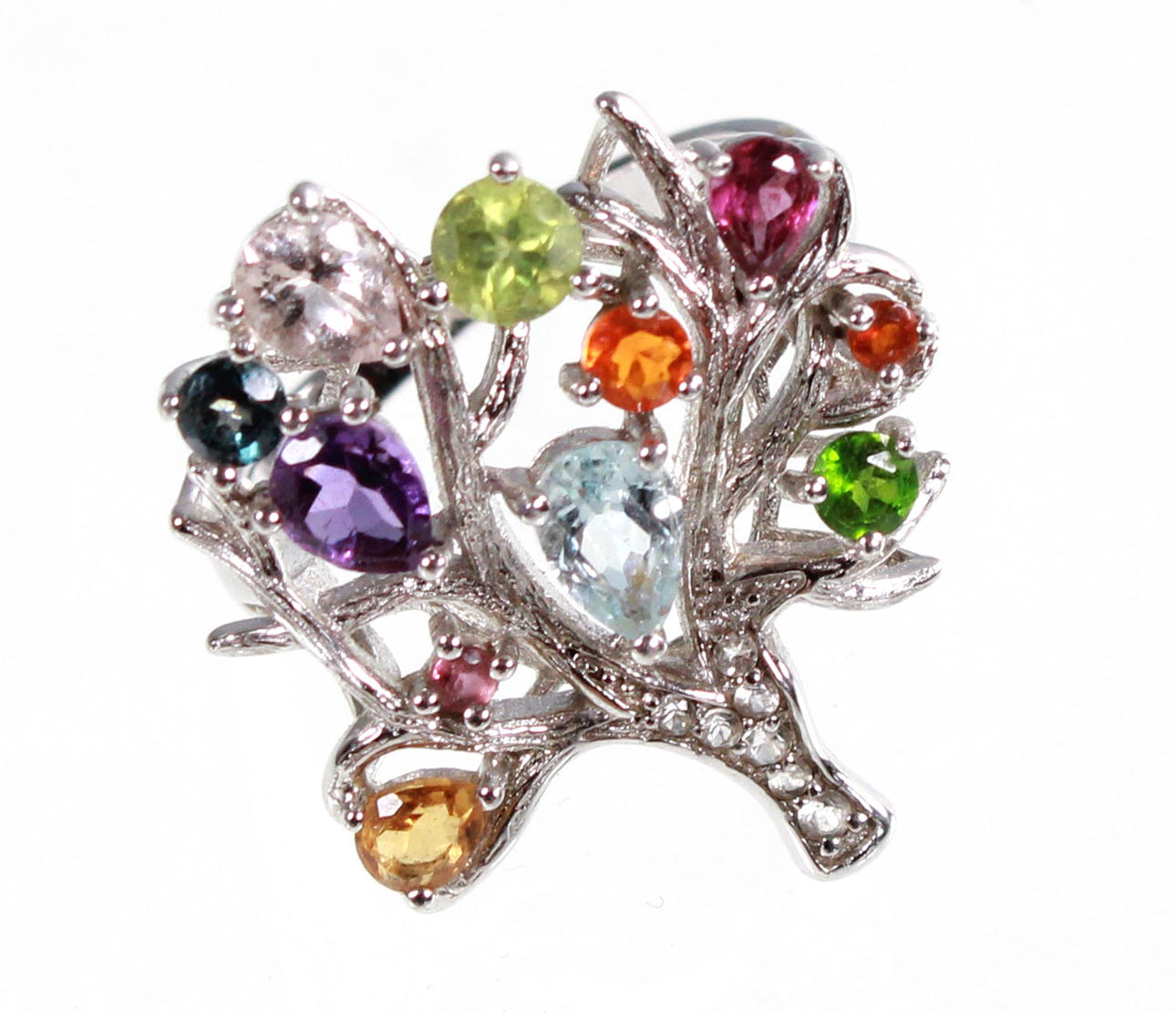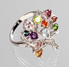 Livets trädring gjord med ädelstenar i 925 silver, ringhuvud i form av ett livets träd dekorerat med olika ädelstenar som ametist, peridot, blå topas, citrin. Ringstorlek 57, ringhuvud 26 x 22 mm, vikt 7,8 gram.
