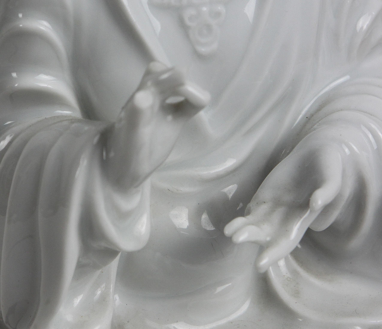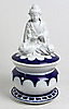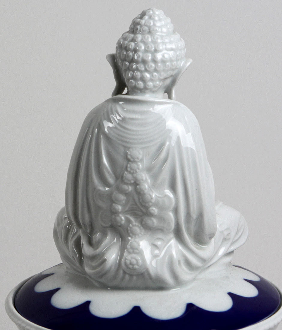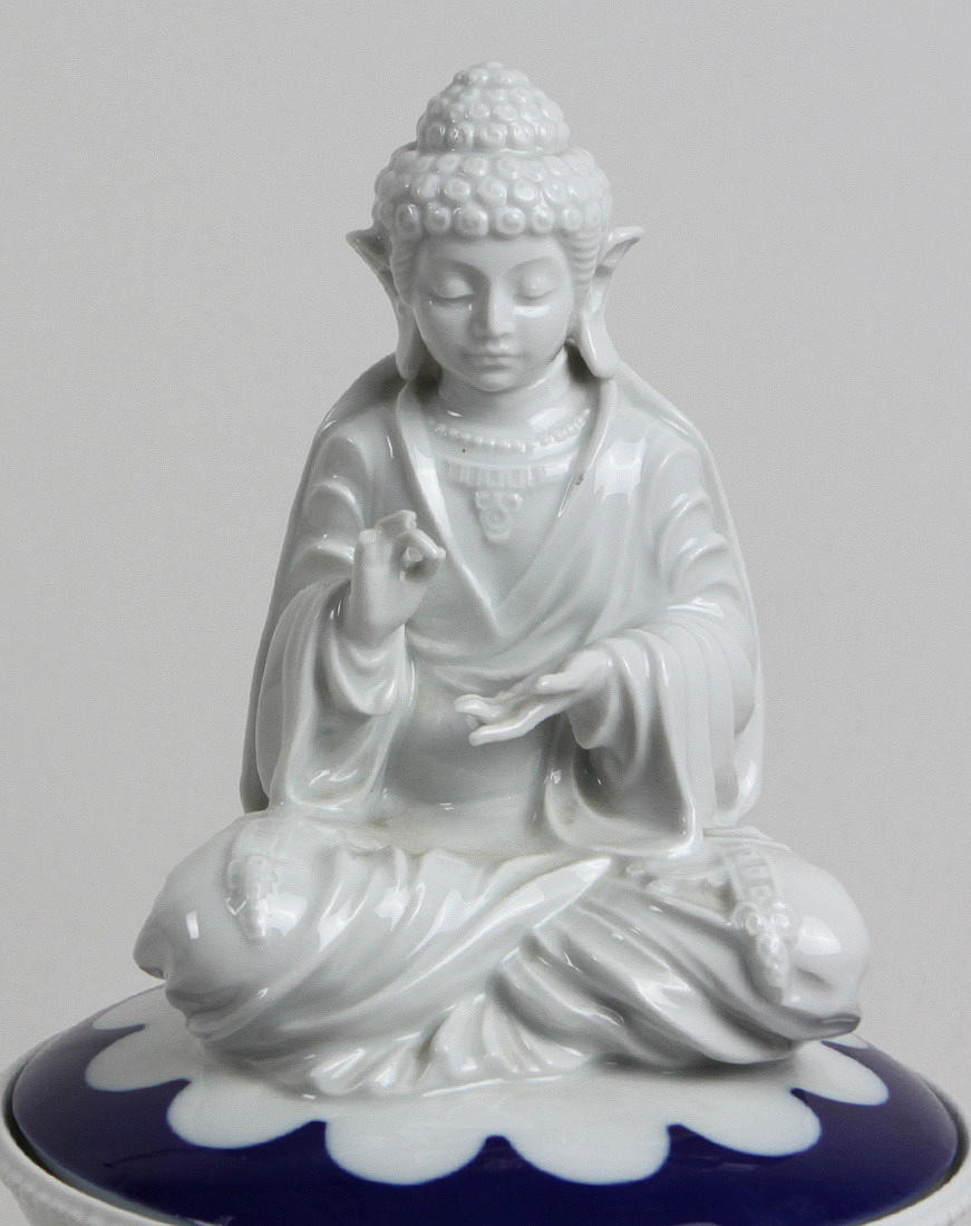 Omarknadsfört porslin, stor bulbous kropp på en kontrasterande lättnad rund stativ och konisk hals med delikat vågig kant, böjt brawnlock med stor skulpturell Buddha i typisk sittvanor, delvis dekorerad med koboltblå underglasyr, höjd ca.. 36cm.