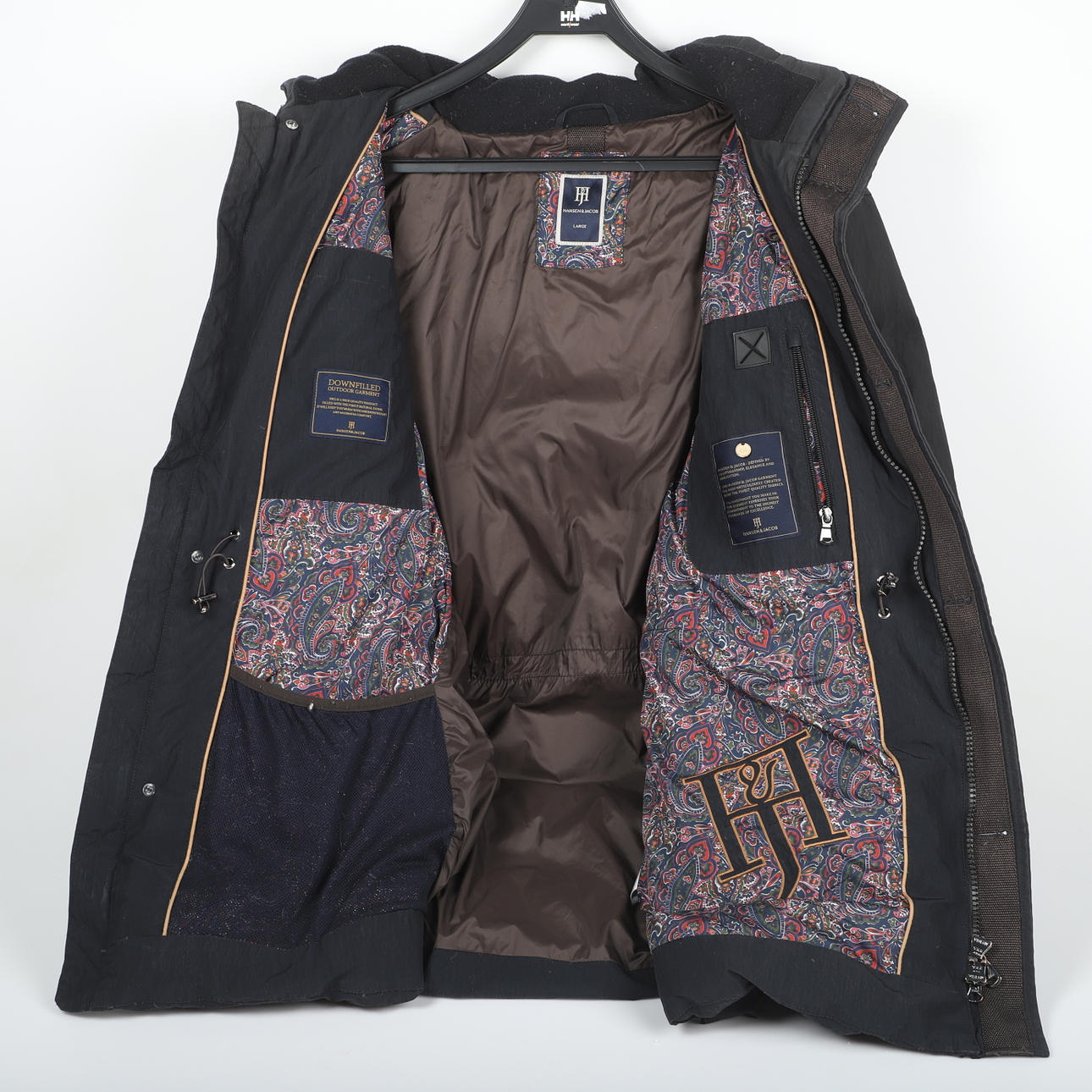 Svart dunjacka med flertalet fickor på in- och utsidan Rygglängd ca 85, ärm innerlängd ca 55 cm Storlek Large.