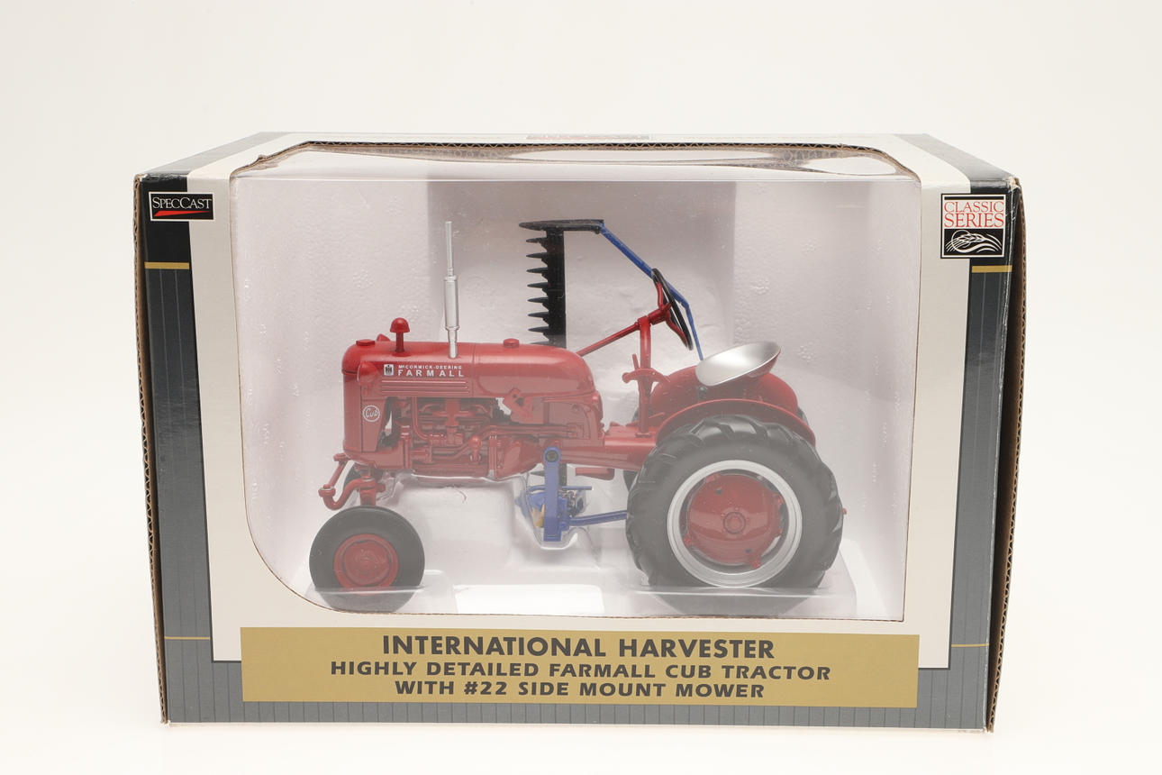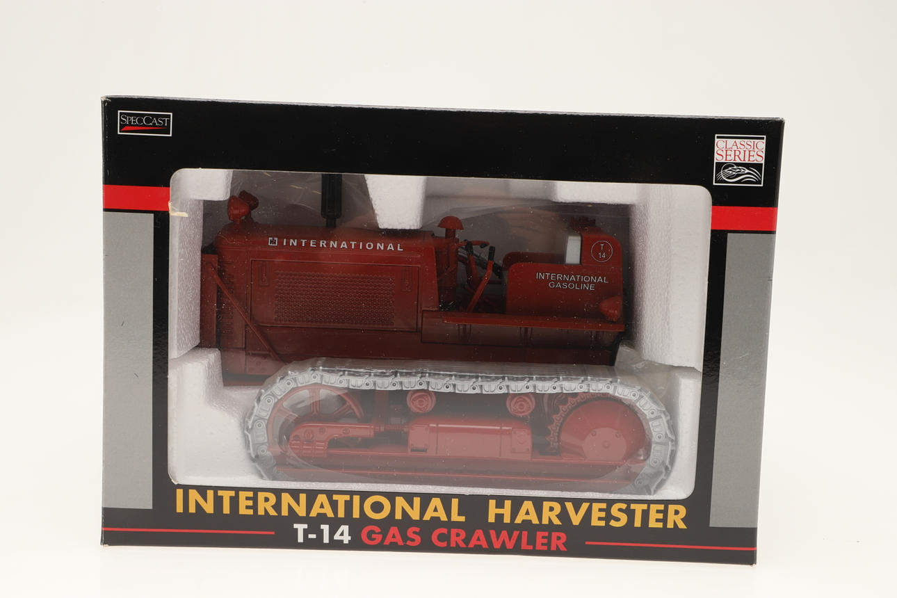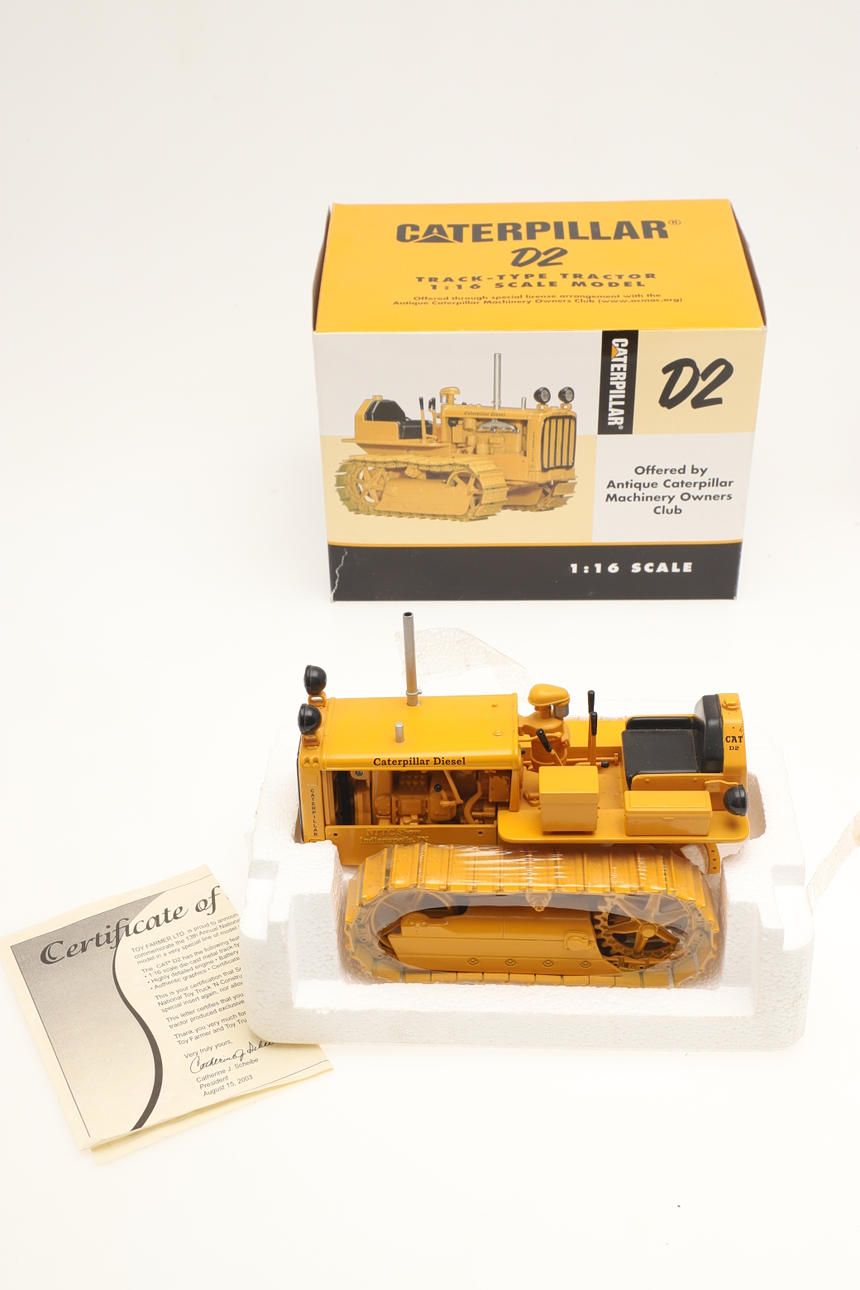 Tre boxade modeller inklusive en Caterpillar D2 Track Type Tractor från Spec Cast (skala 1/16), en Spec Cast Farmall Cub-traktor med gräsklippare (skala 1/16) och en Spec Cast T14 Gas Crawler (skala 1/16). (3).