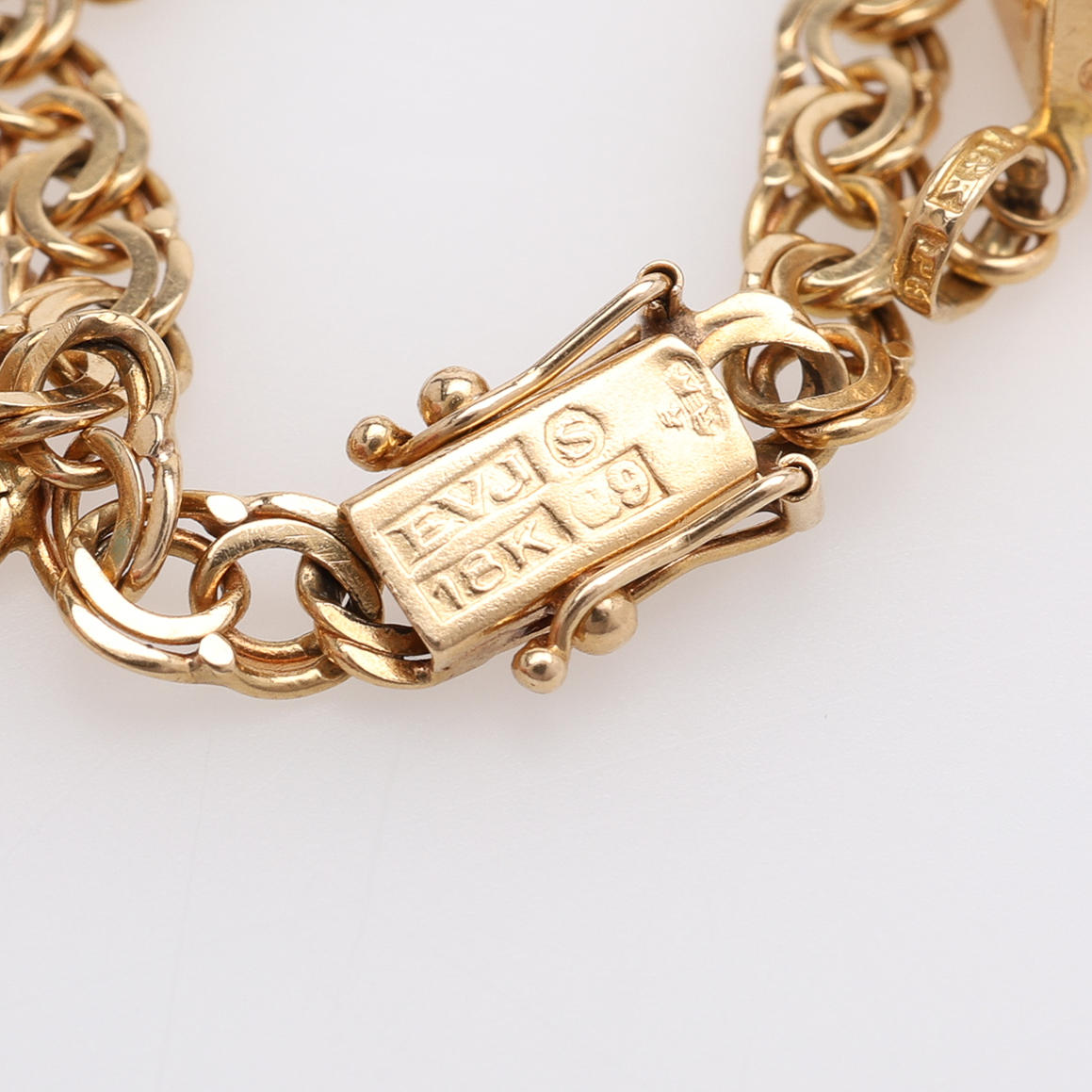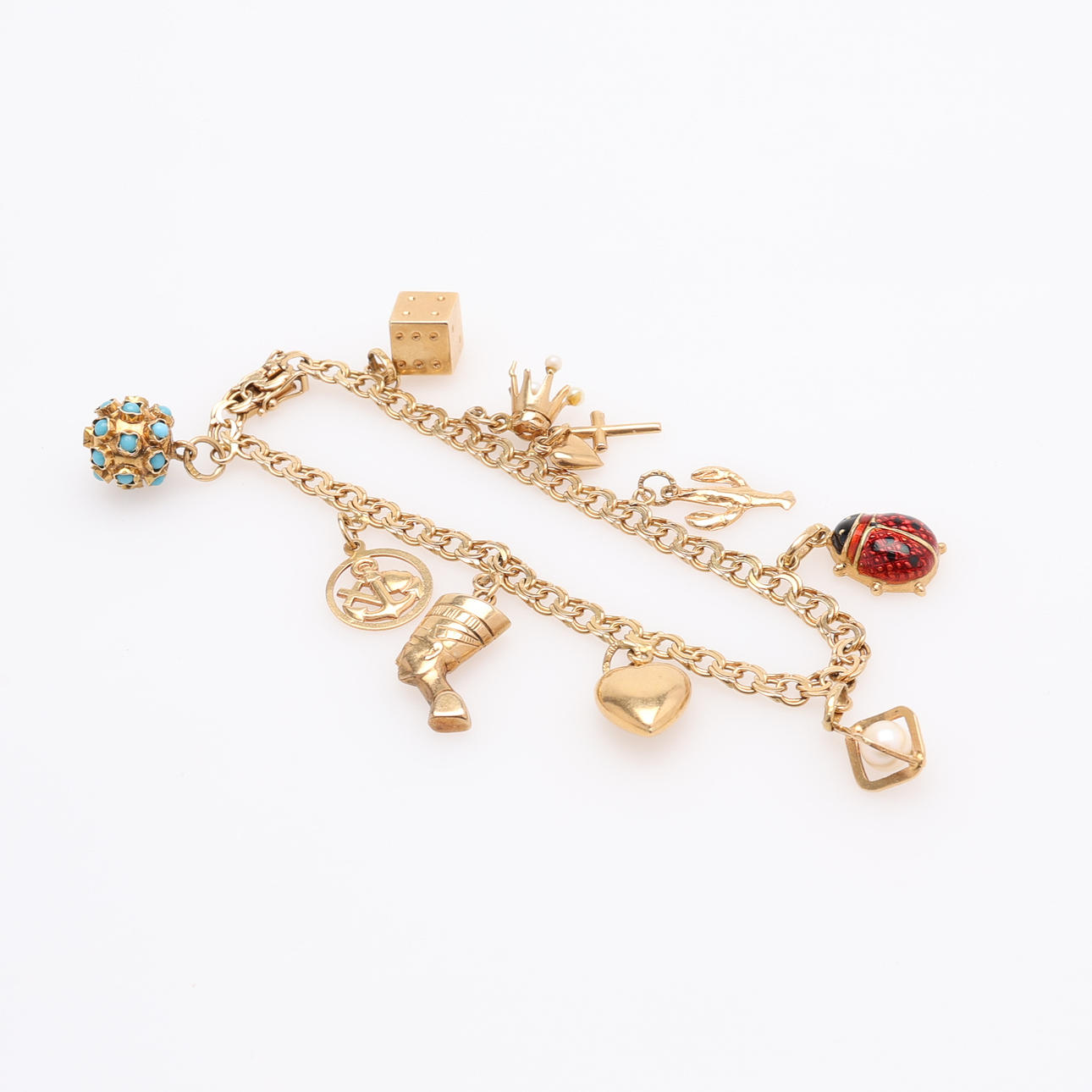 Bismarcklänk med instickslås samt tio berlocker, längd ca 19 cm.