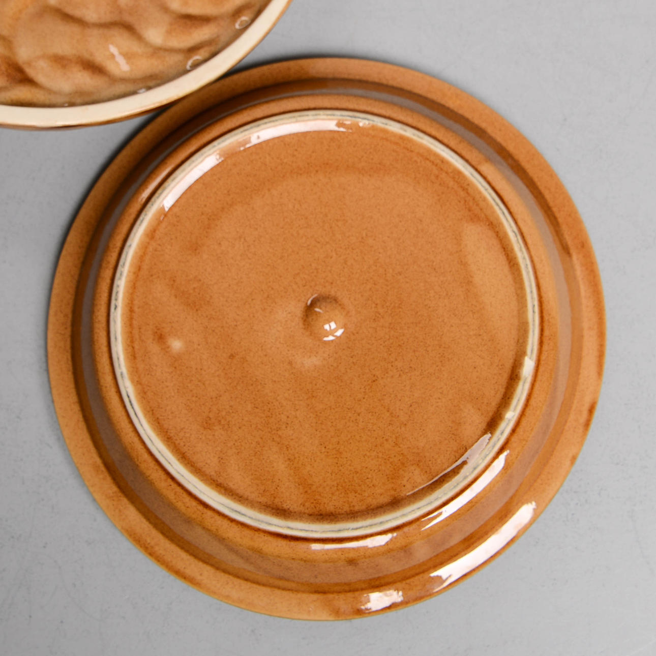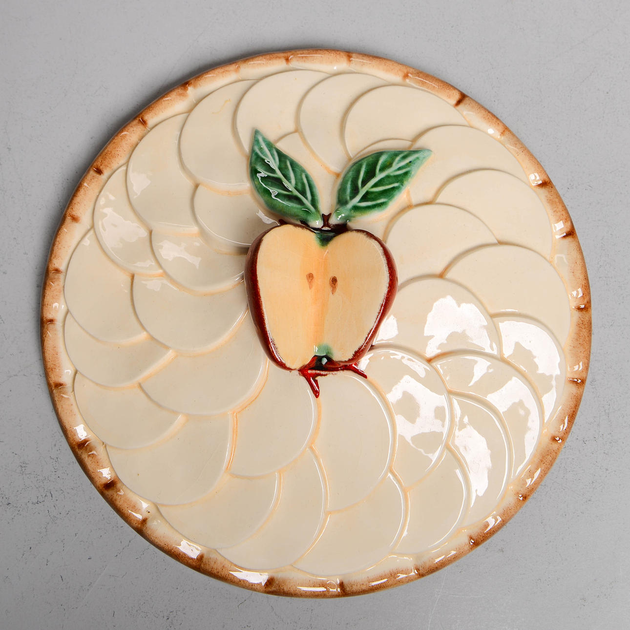 Form med lock, dekor av äpple. Diameter ca 27,5 cm.