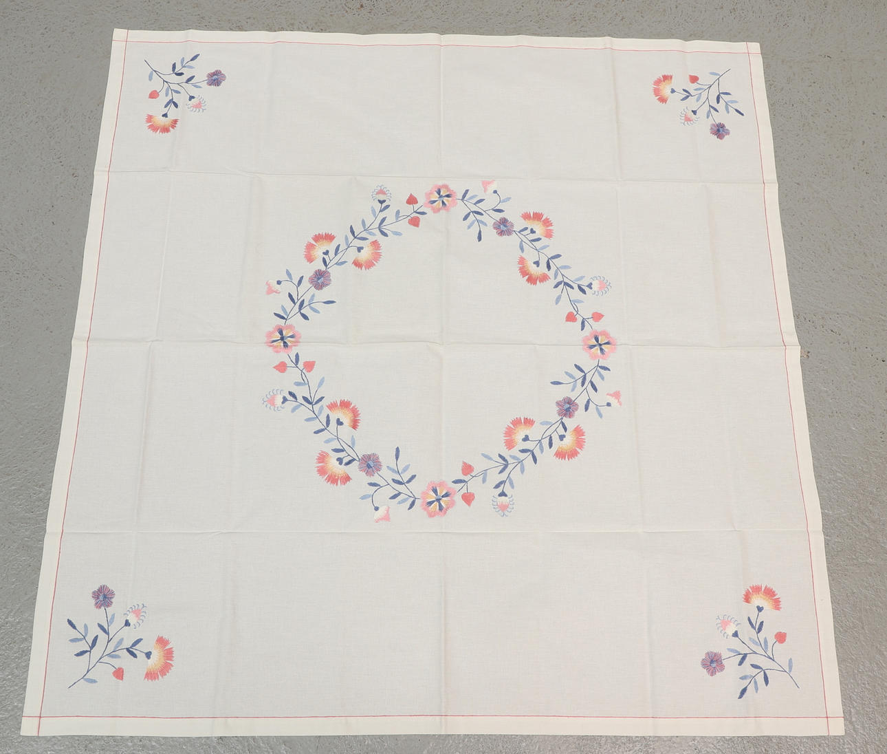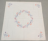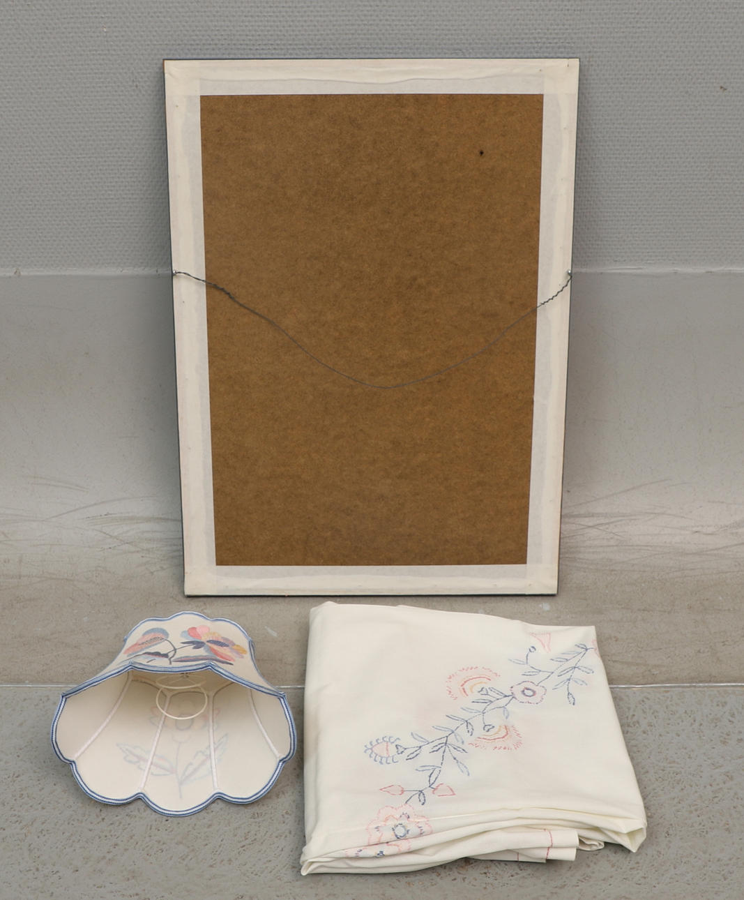 Textiltavla, inglasad ram, rammått ca 61,5x44,5 cm. Lampskärm, höjd ca 17,5 cm. Duk, ca 120x120 cm.