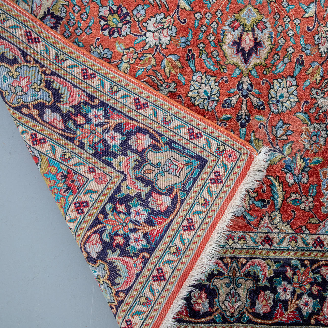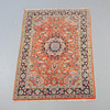 ull och siden. Polykromt faunalt och blommönster Oval, lockig medaljong med vegetabiliska vinstockar på röd bakgrund.