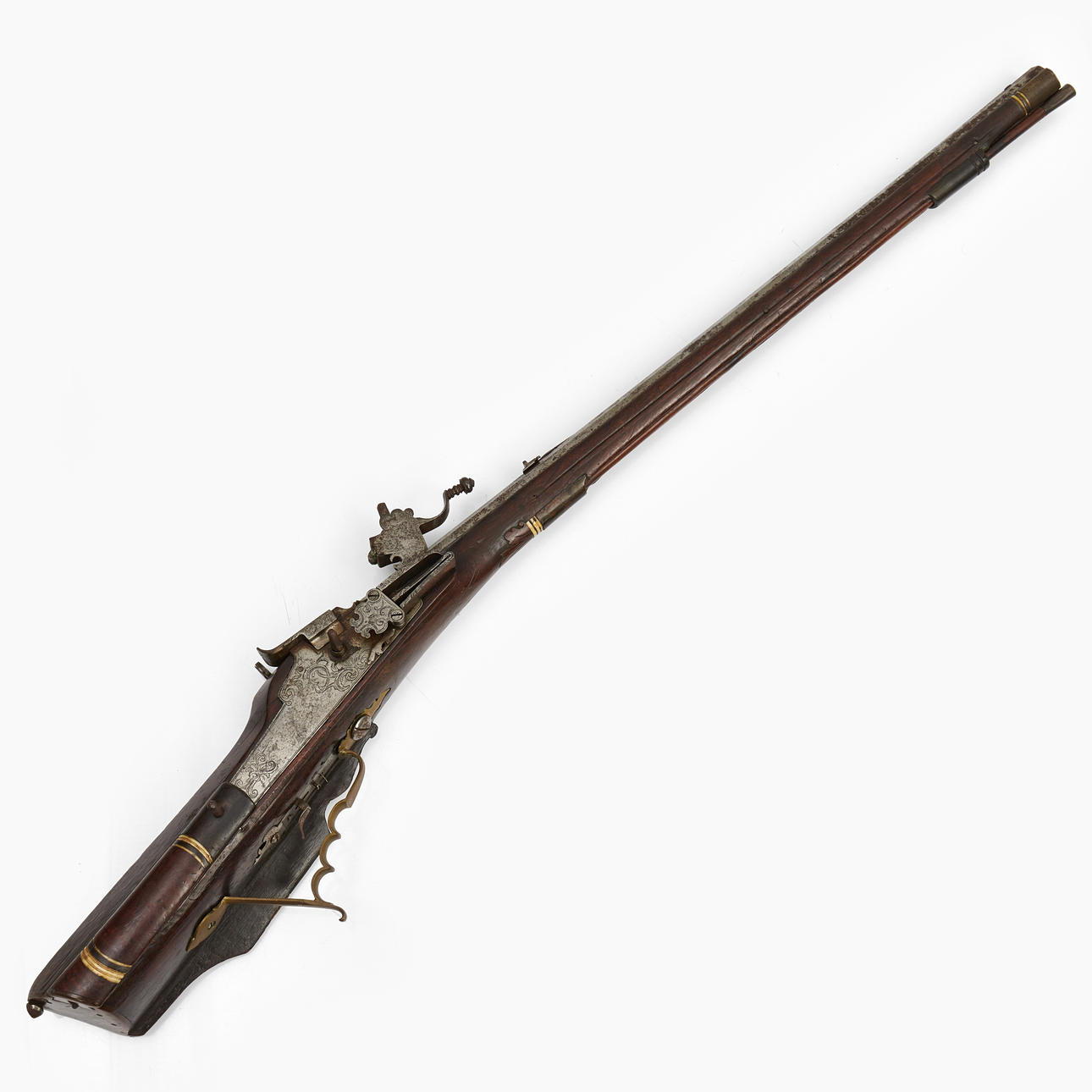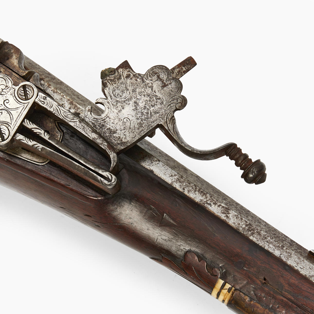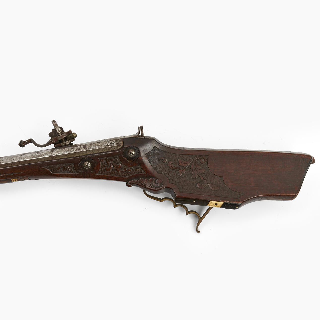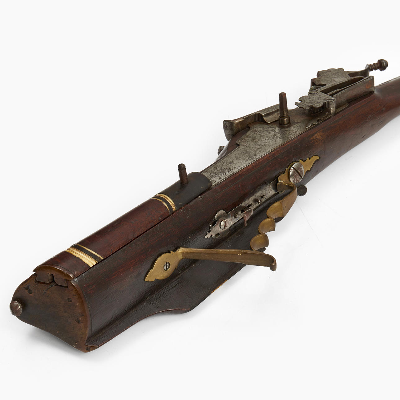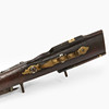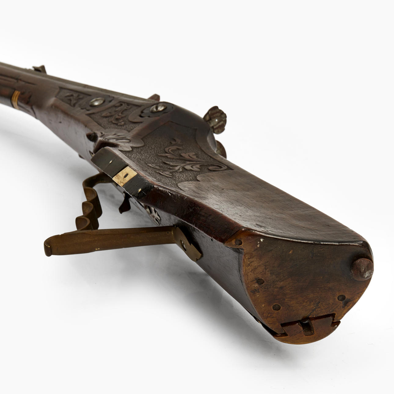 Valnöt med skuren dekor och inläggningar i ben. Pipans längd 77 cm. Totalt 108 cm. Räfflad pipa med kaliber 15 mm.