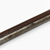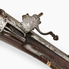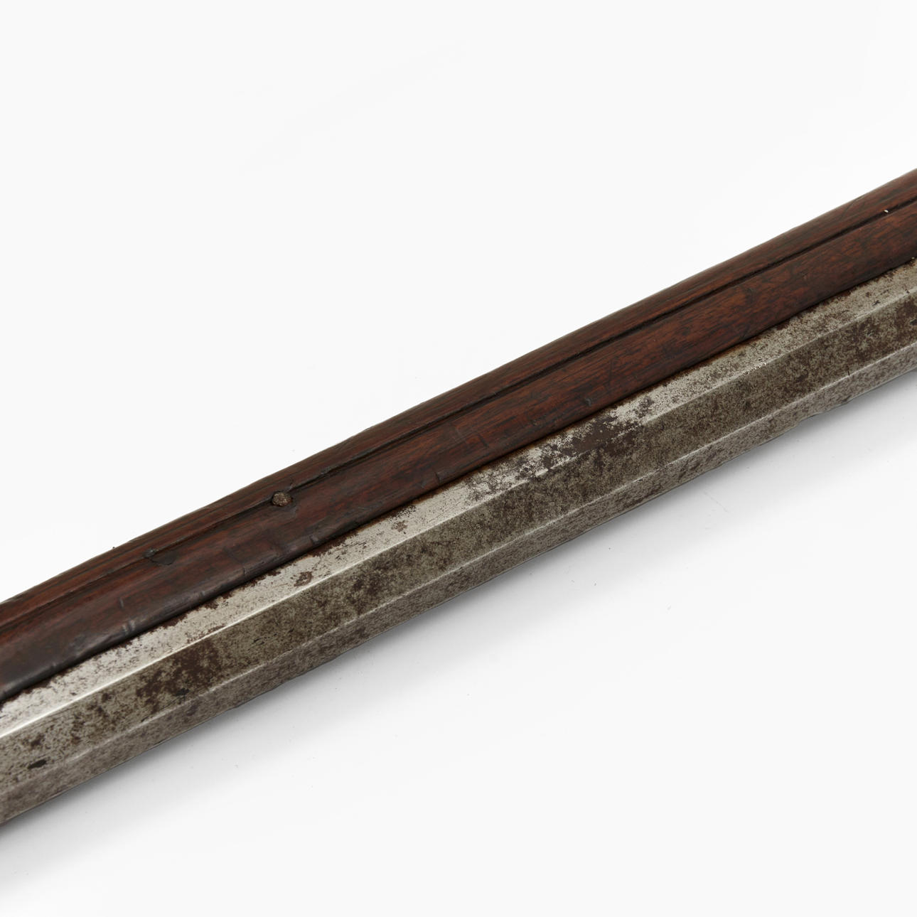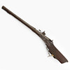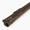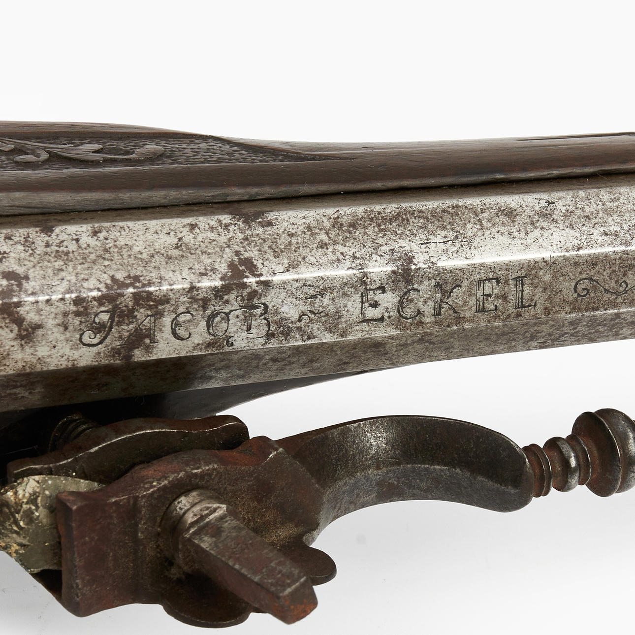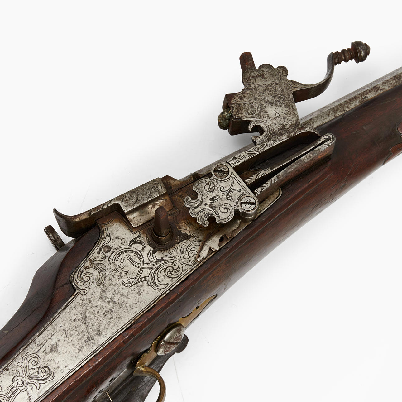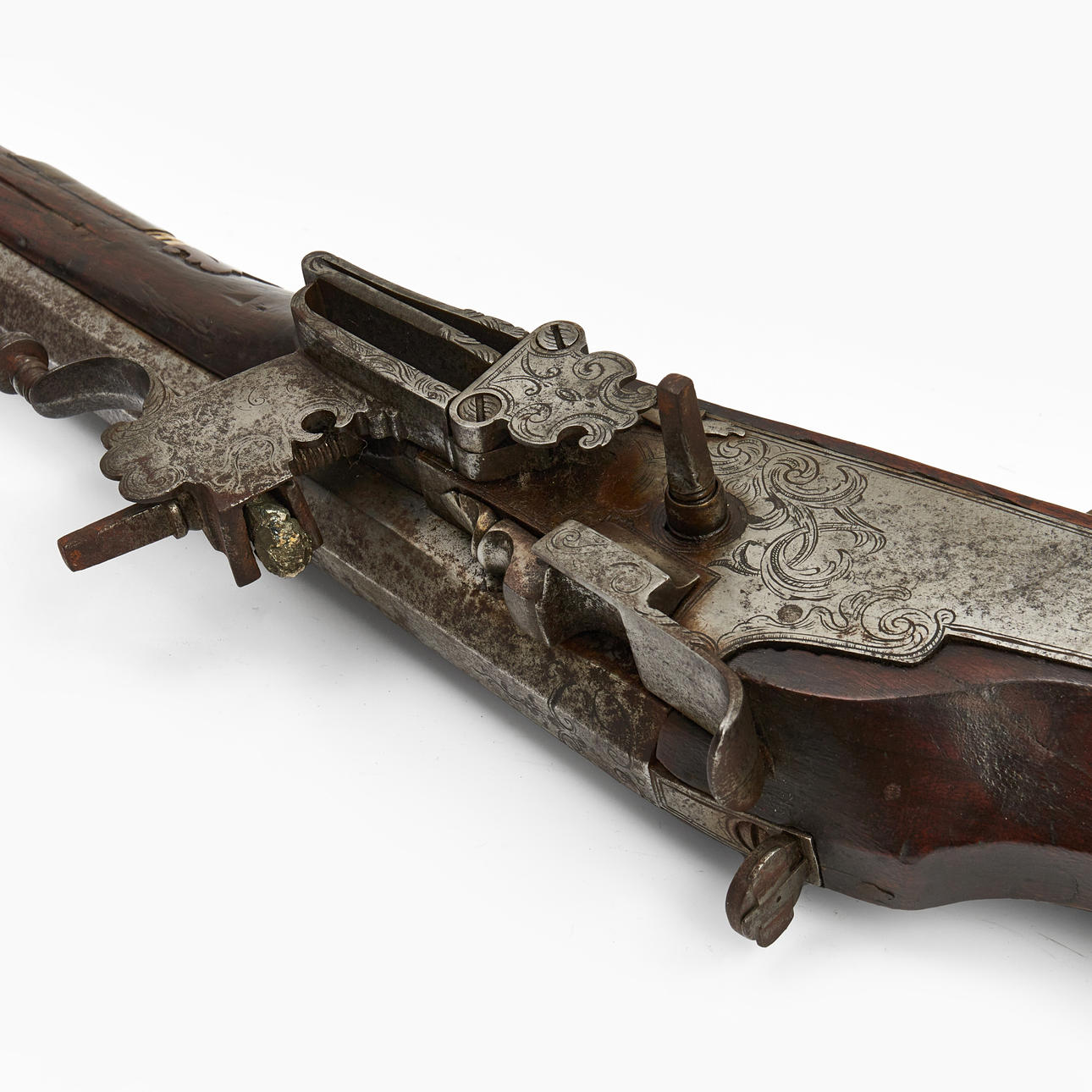 Valnöt med skuren dekor och inläggningar i ben. Pipans längd 77 cm. Totalt 108 cm. Räfflad pipa med kaliber 15 mm.