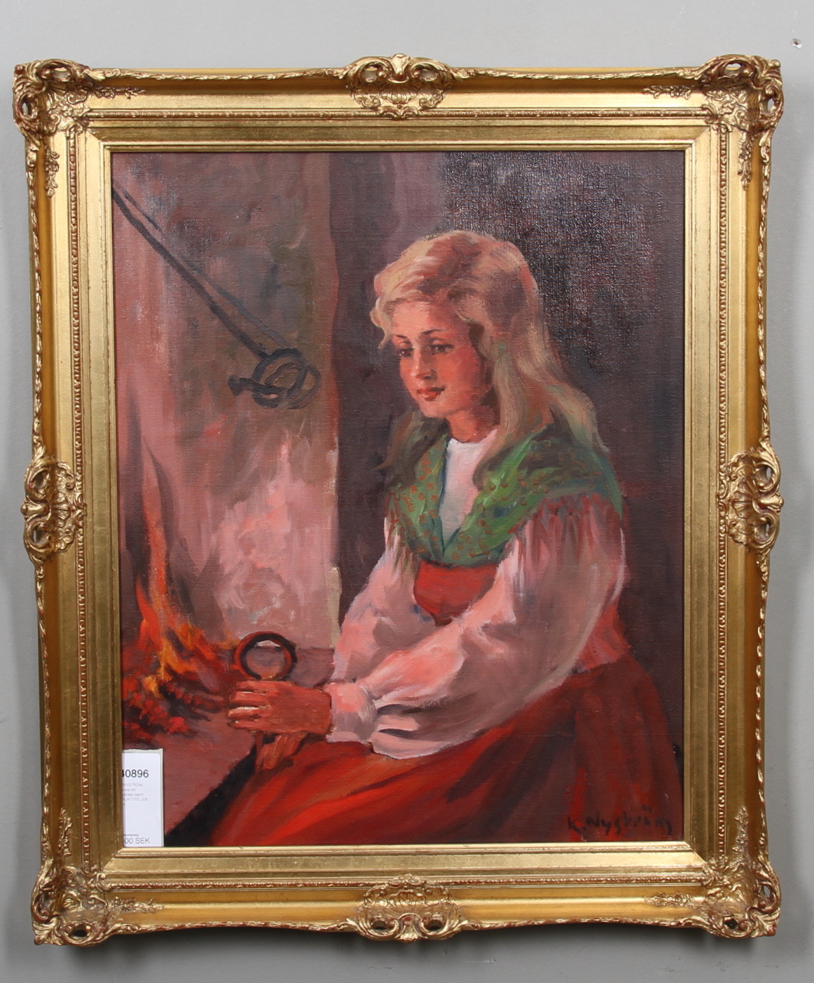40896. K.NYSTRÖM. Flicka vid eldstad, samt FRUKTSTILLEBEN.
