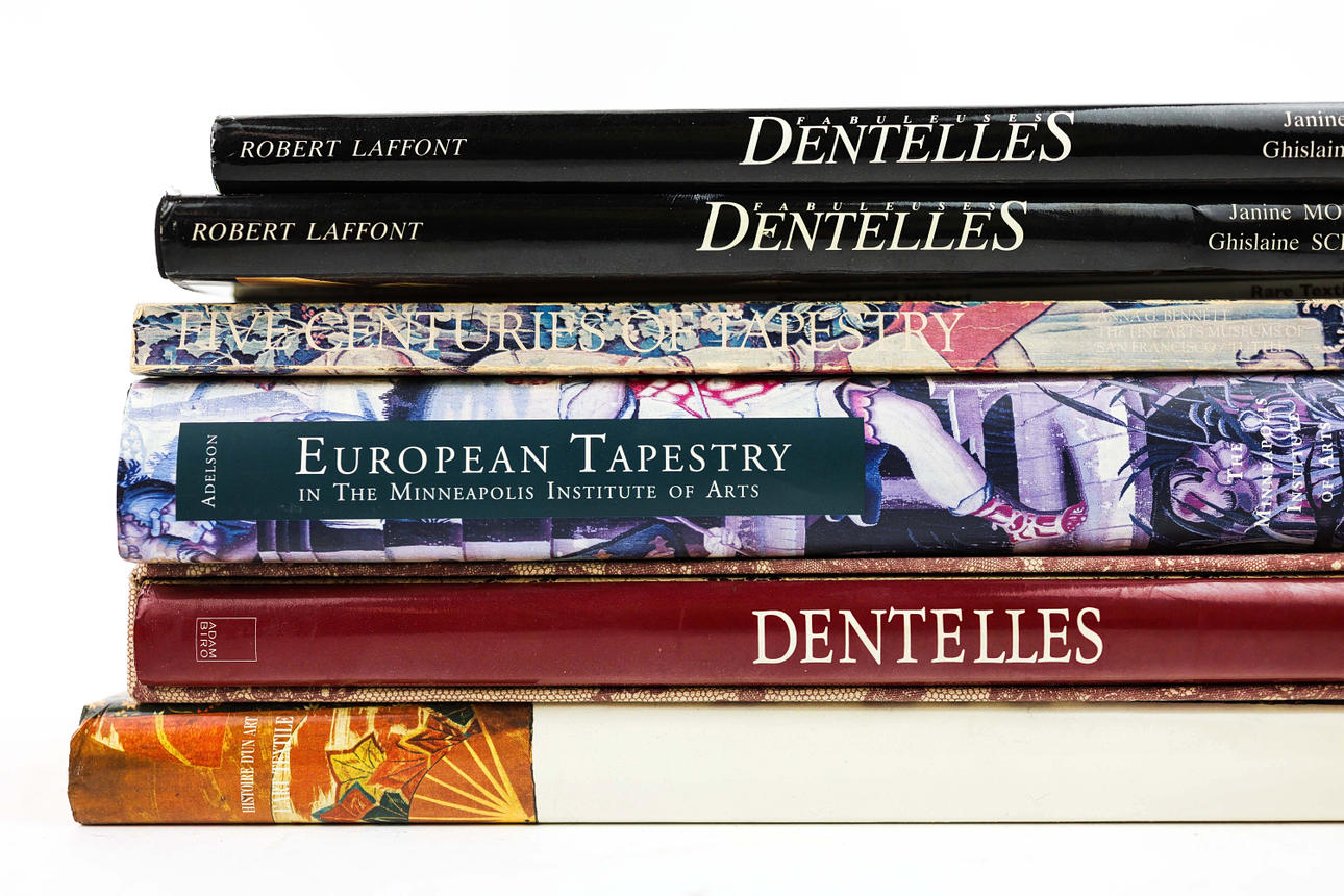 En samling böcker om mode, textilier och smycken. Olika språk. Inkluderar ”The Kashmir Shawl” av Frank Ames; ”European Tapestry in the Minneapolis Institute of Arts”; ”En illustrerad guide till spets” av Emily Reigate.