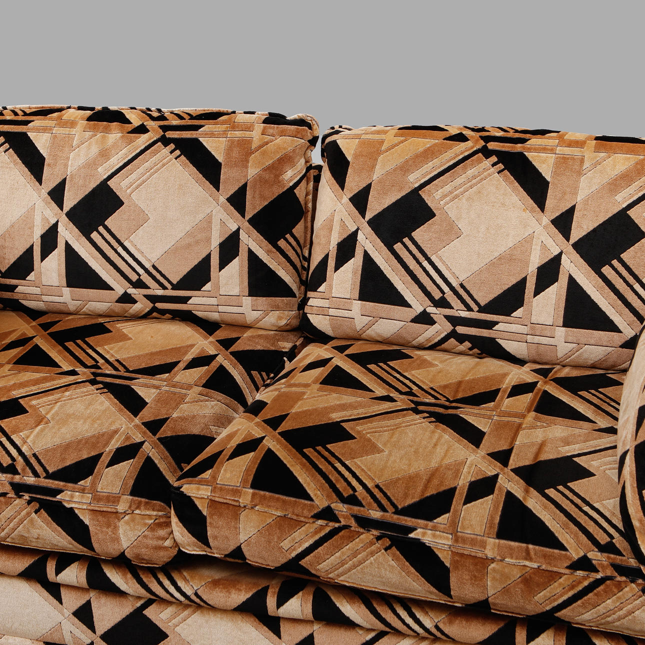 Mönstrat tyg i geometrisk dekor. Lösa plymåer. Längd ca 170, djup ca 85, sitthöjd ca 40, rygghöjd ca 75 cm.