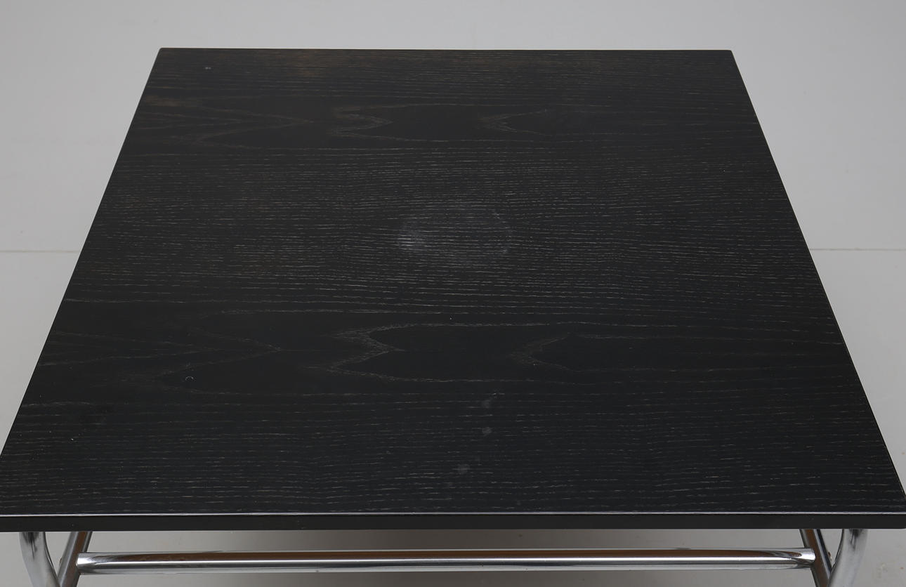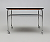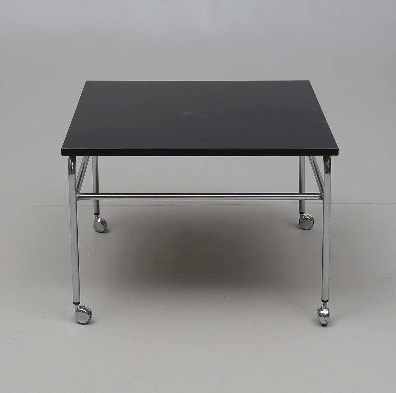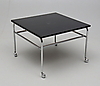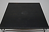 Träskiva med metallunderrede på hjul. Längd 70, bredd 70, höjd 49 cm.