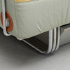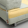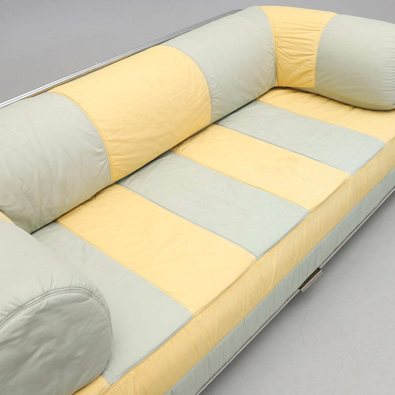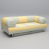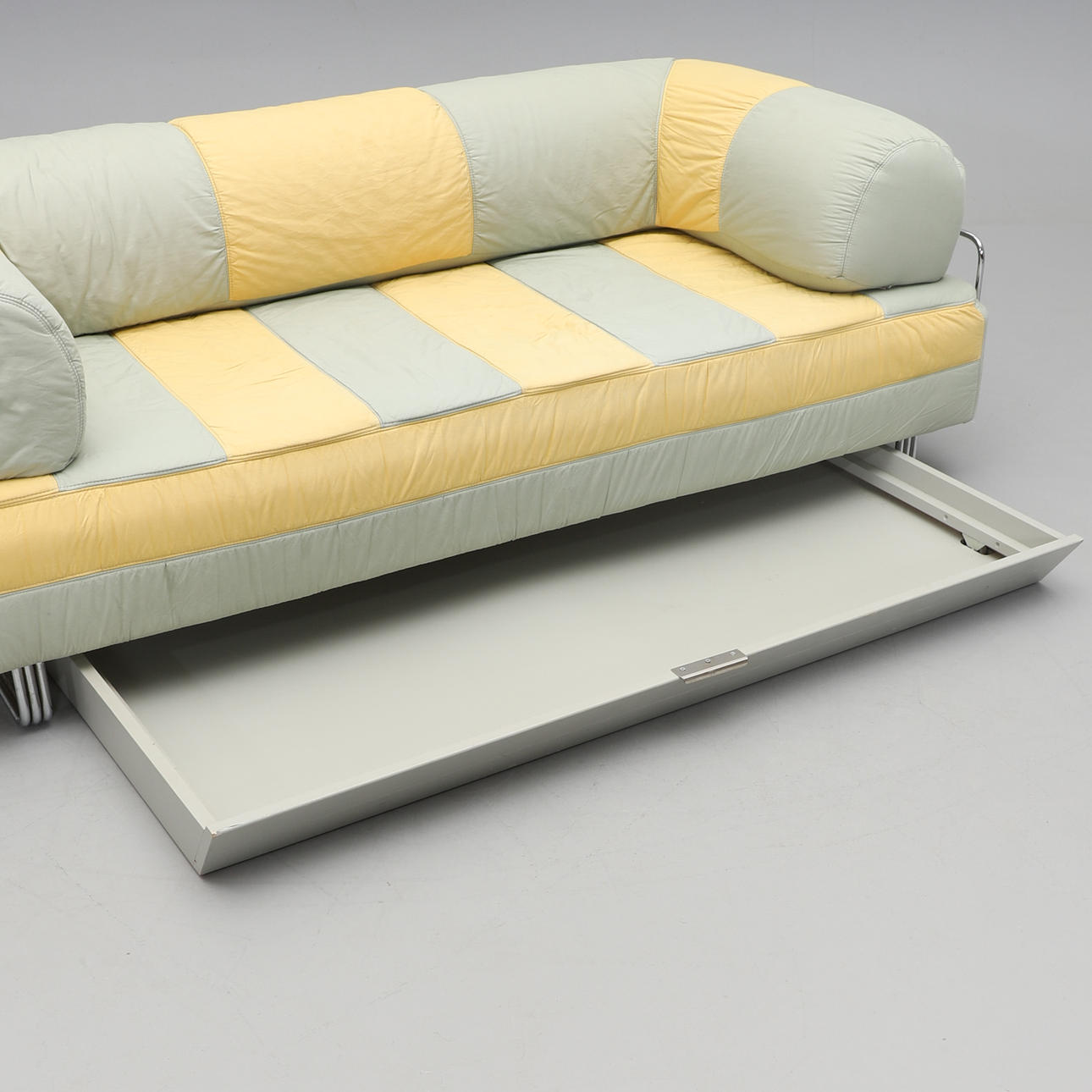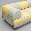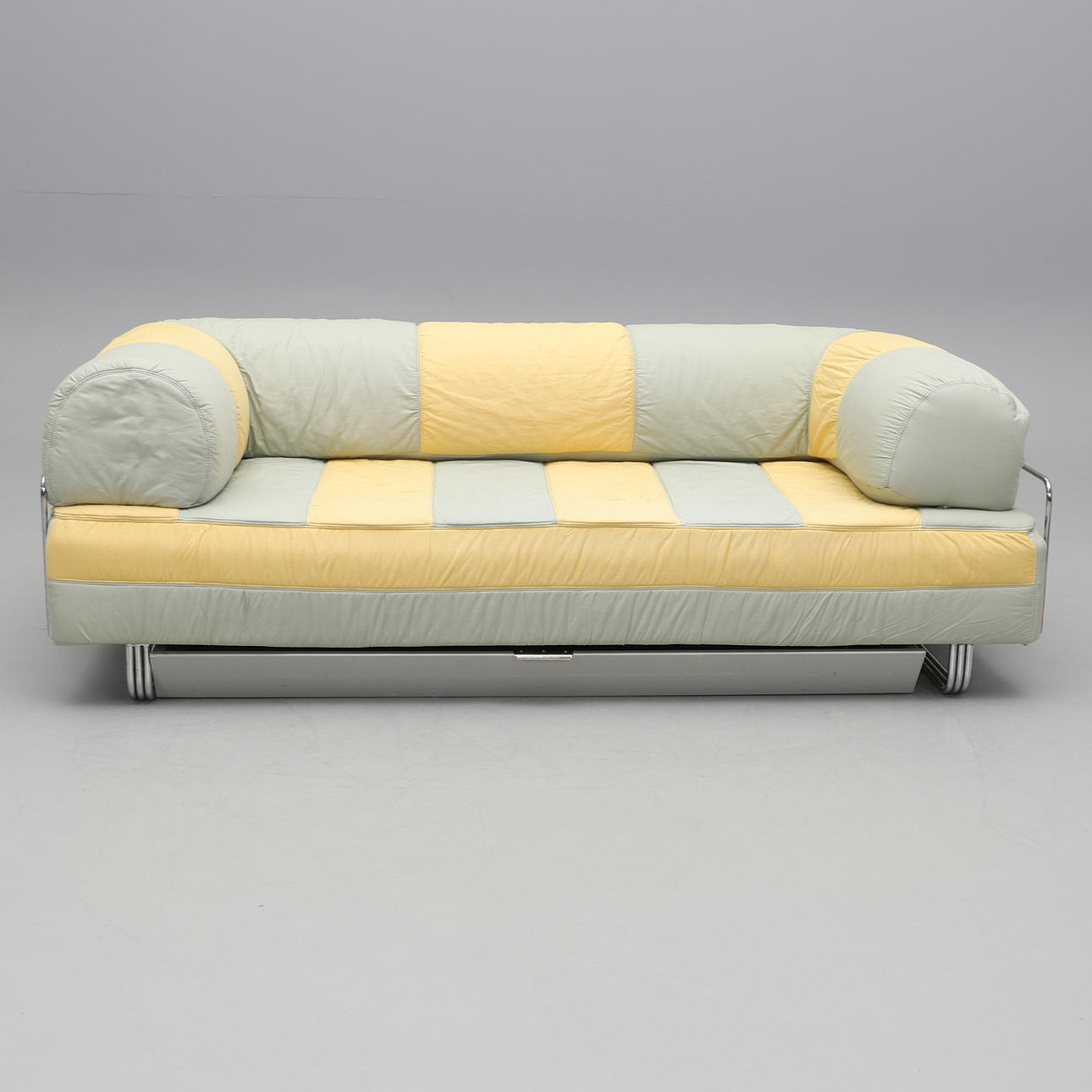 Förkromad stålrörsstomme. Stoppad madrass. Avtagbar ryggdyna. Randig textilklädsel. Förvaring på hjul undertill. Längd 200, djup 90, rygghöjd 70, sitthöjd 40 cm.