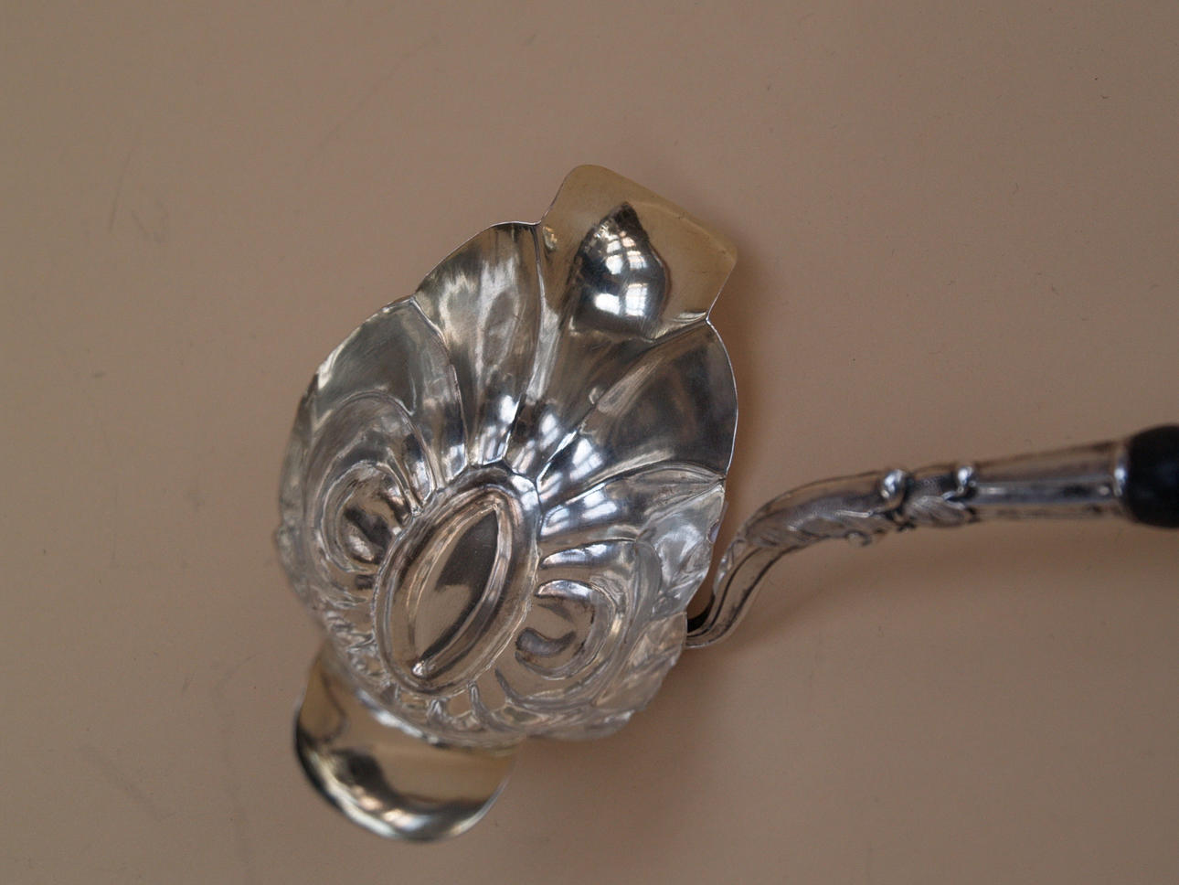 Slev - Biedermeier, troligen underlegerat silver, bladklädsel delvis mejslat, eboniserat vänt trähandtag delvis enligt bäst.,, l.ca. 39 cm.