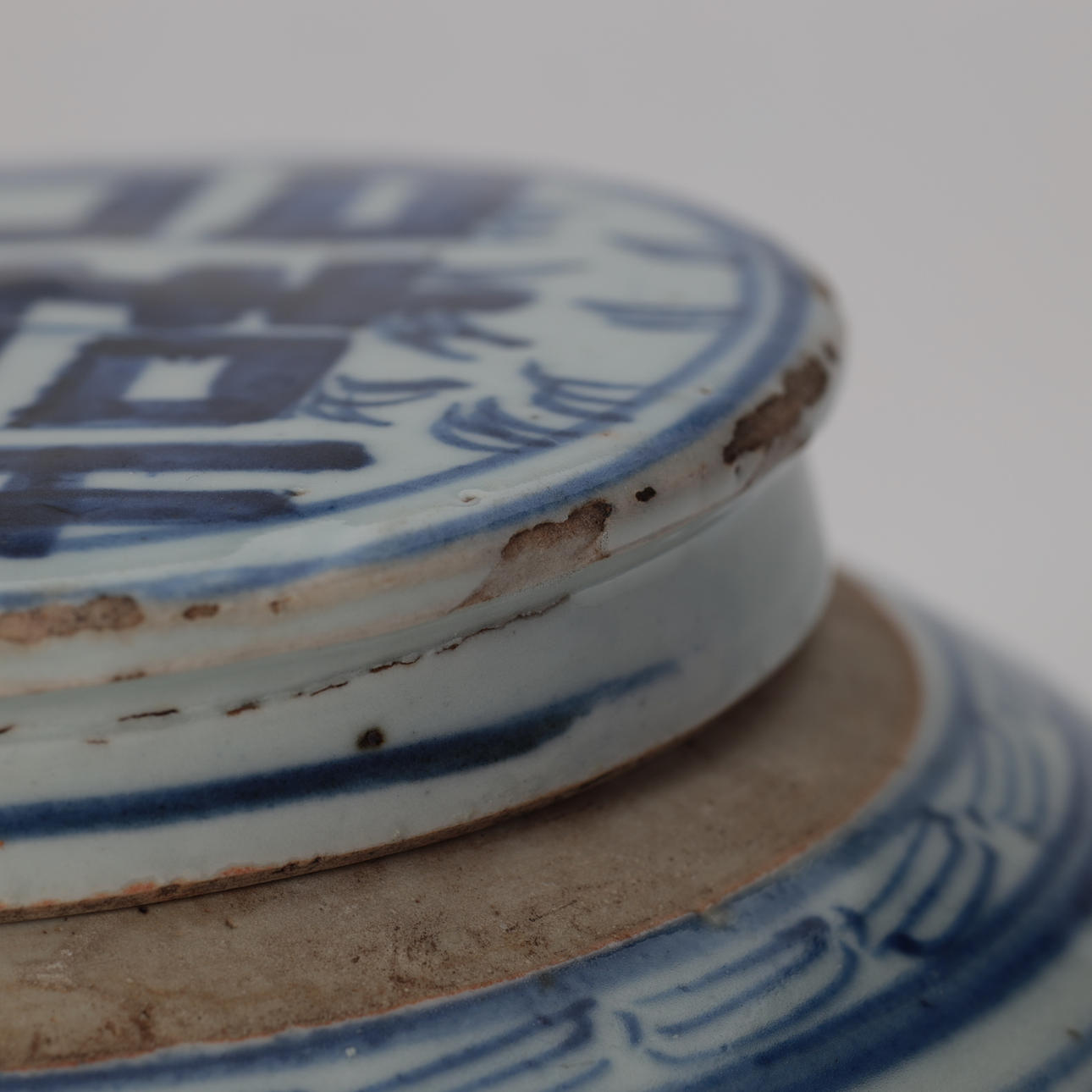 Med åldersrelaterade spår av användning och glasyrvägran på locket.