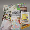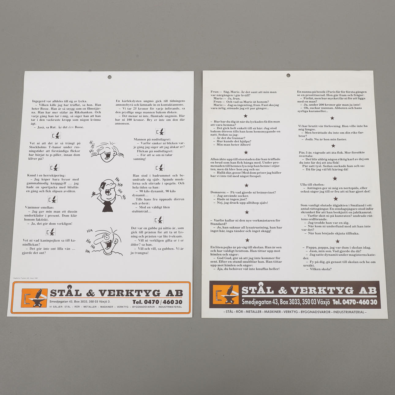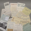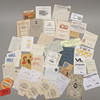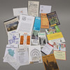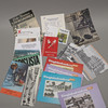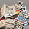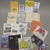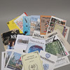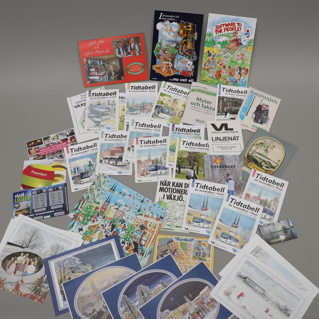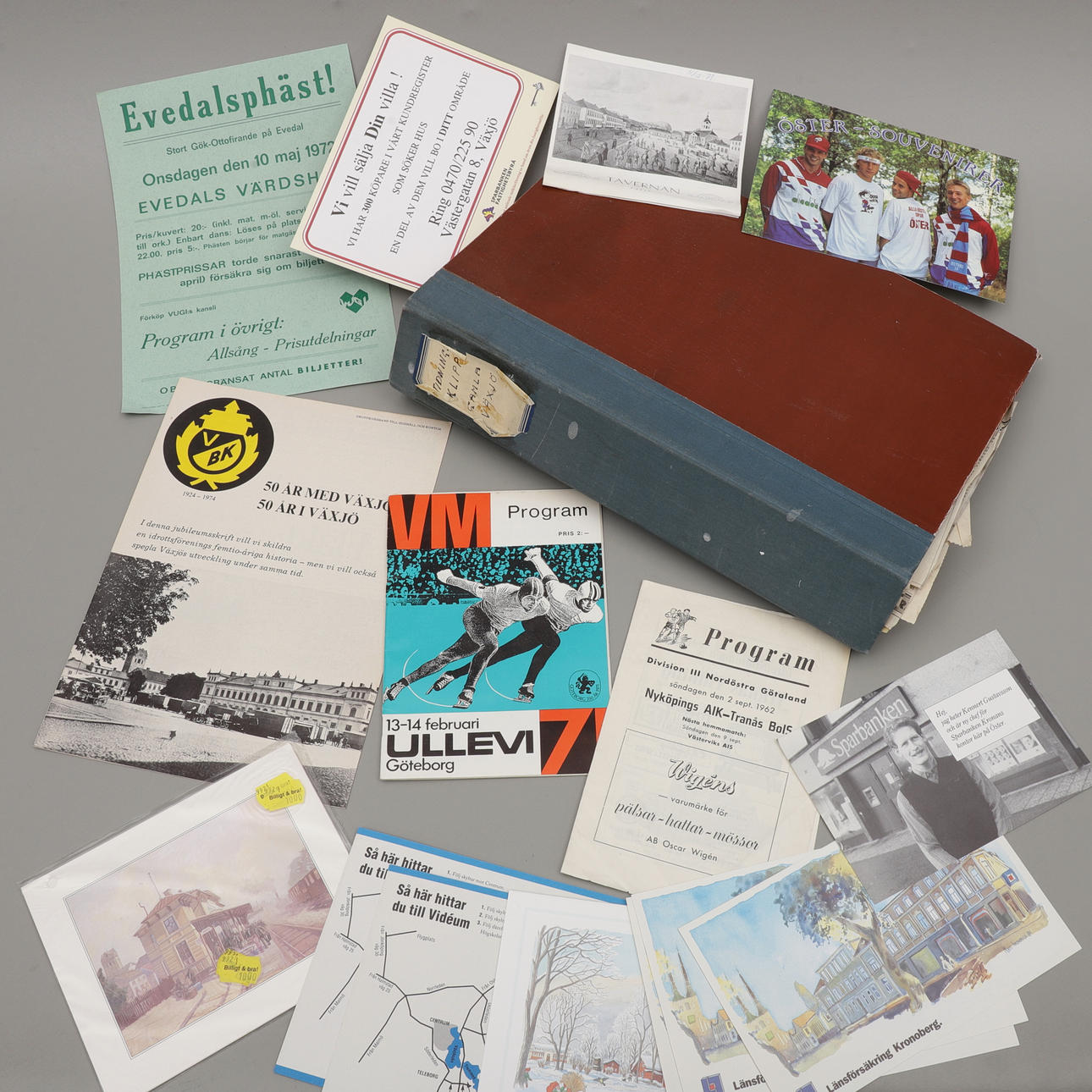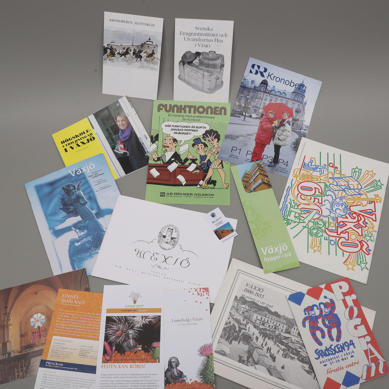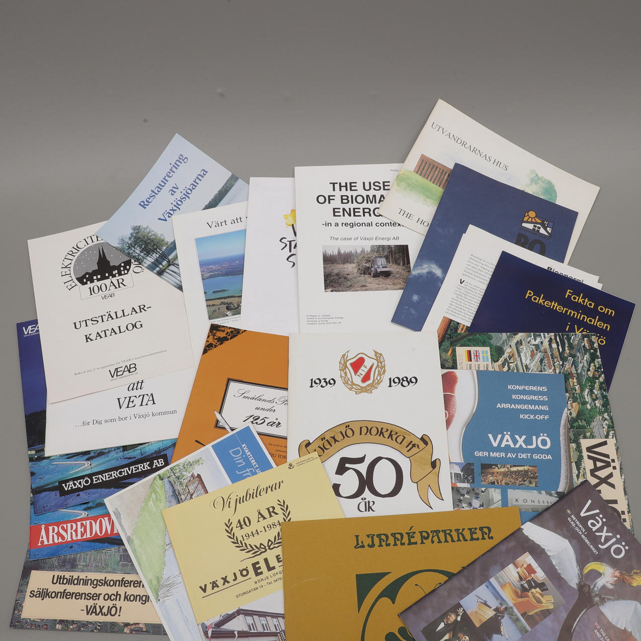 En flyttlåda full med Växjörelaterade broschyrer, foldrar, kataloger, reklammaterial, samhällsinformation, kvitton, julkort med Växjömotiv, tidningsurklipp, kuvert, reklamtrycksaker, priskuranter, kalendrar mm mm.