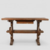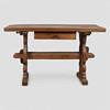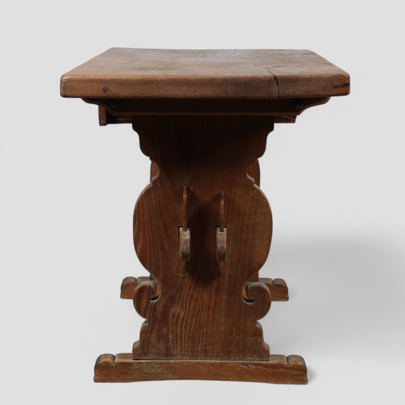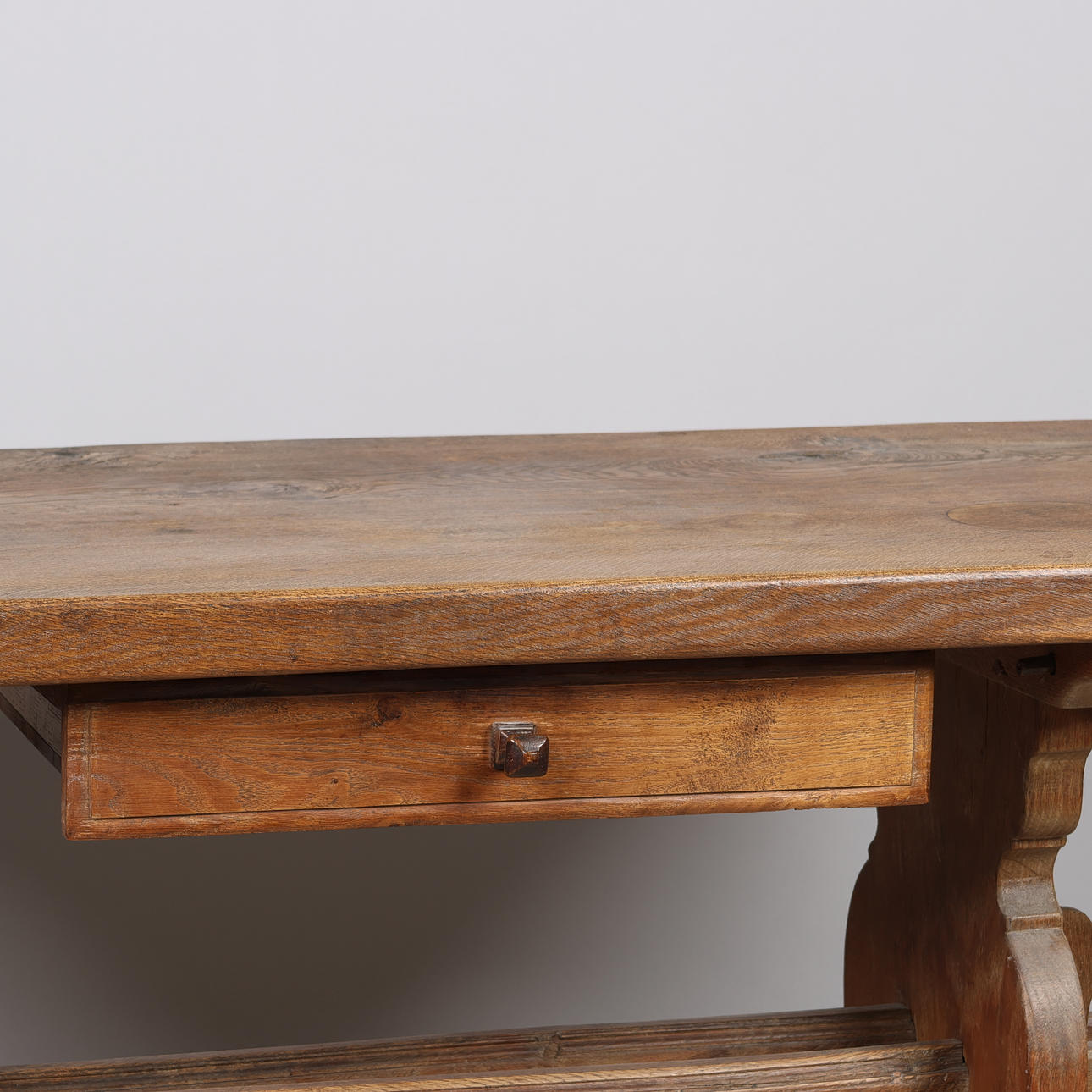 Tung ålder och användningsslitage, inklusive repor, märken, fläckar och reparationer ovanpå. Toppen verkar slät.