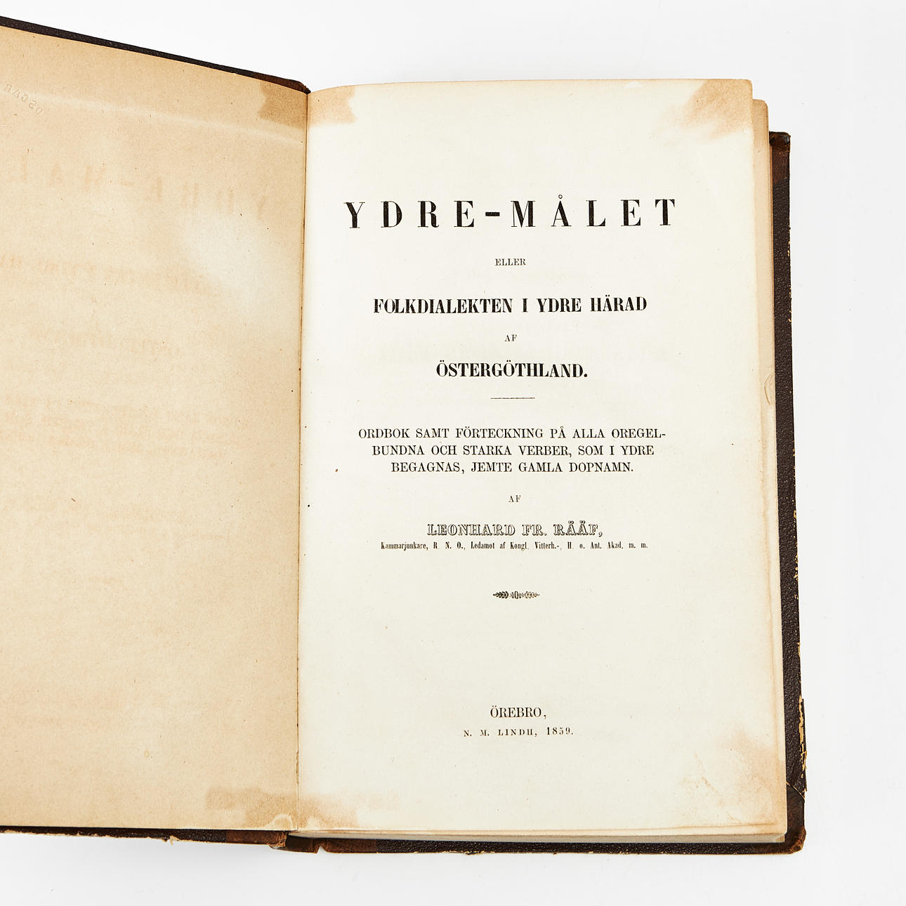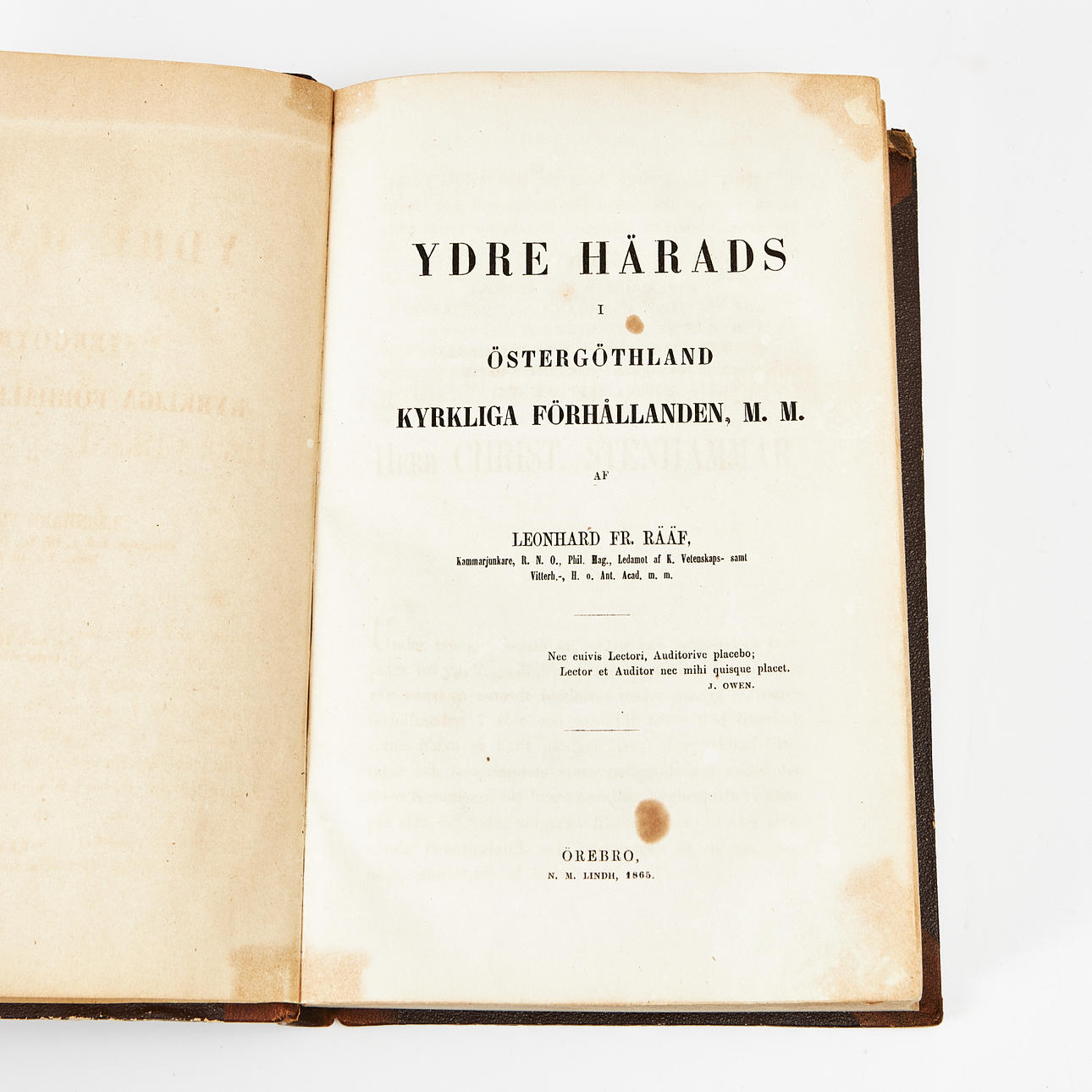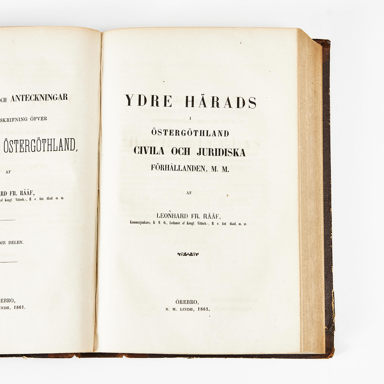RÄÄF, LEONHARD FREDRIK. Samlingar och anteckningar till en beskrifning öfver Ydre härad i Östergöthland. 5 delar i 4 volymer. Del 3 i dubblett. Del 5 saknas. Linköping, C. F. Ridderstad, 1856 / Örebro, N. M. Lindh, 1859-65. 8:o. 210 x 145 mm. Samtida halvfranska band. 3 volymer med Sven Lindéns exlibris