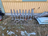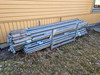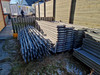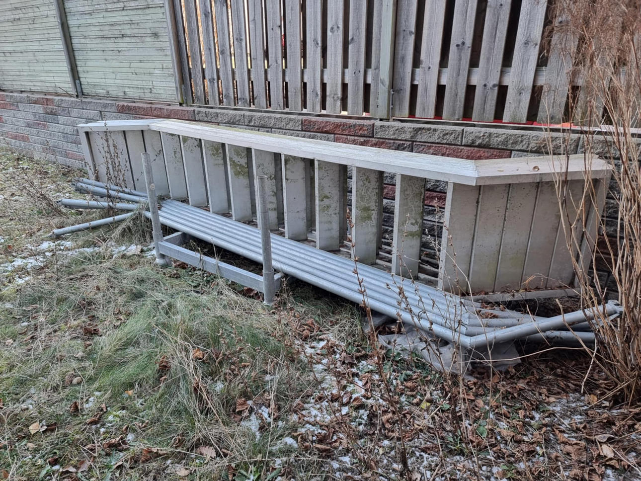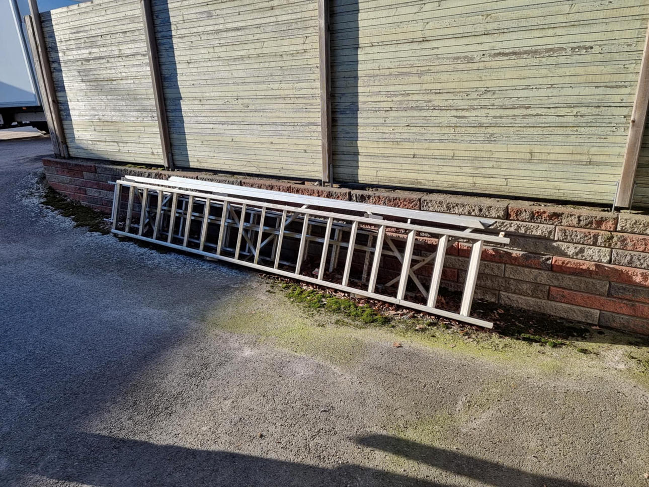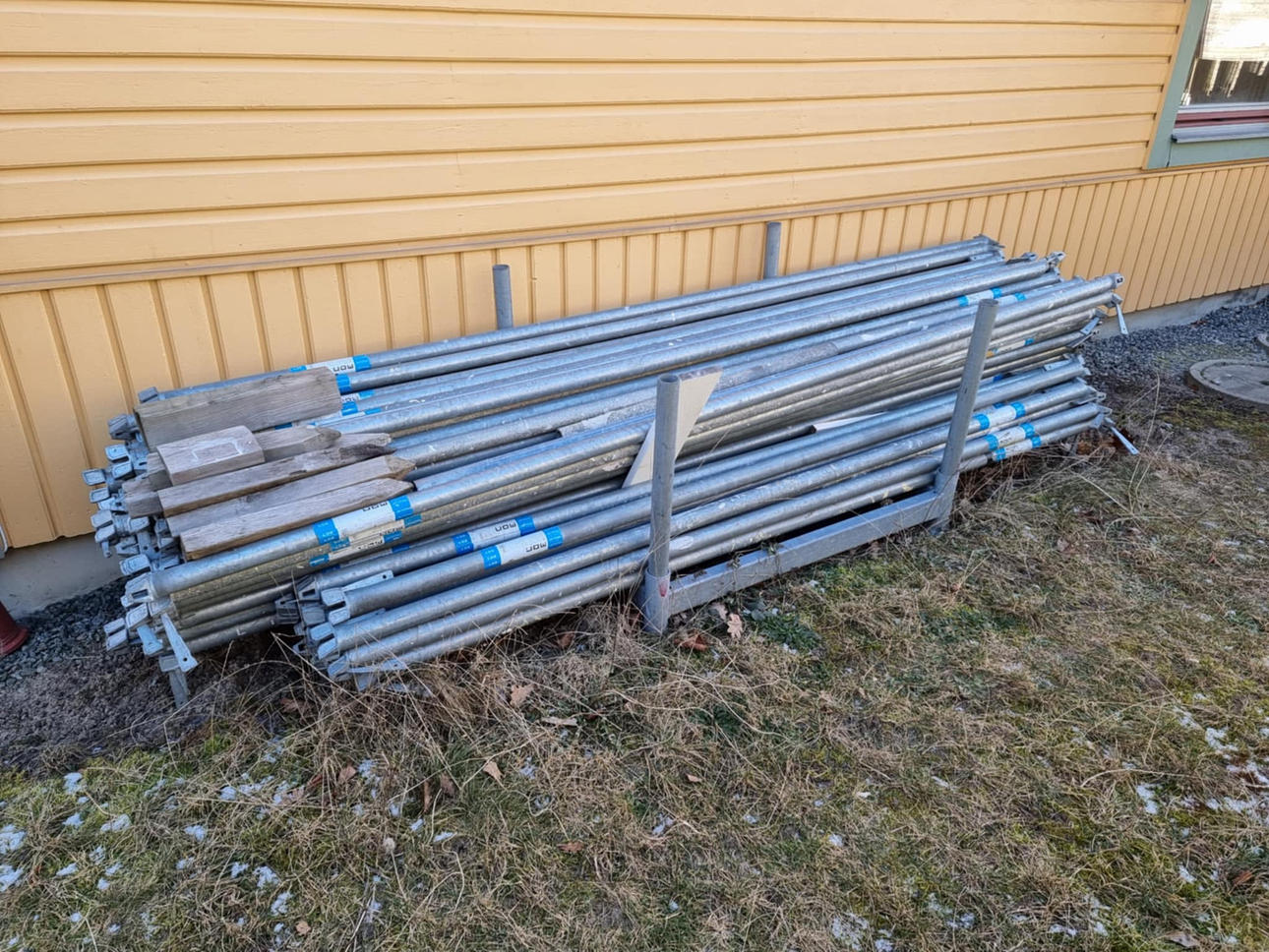 Byggnadsställning i många delar med stegar etc.
