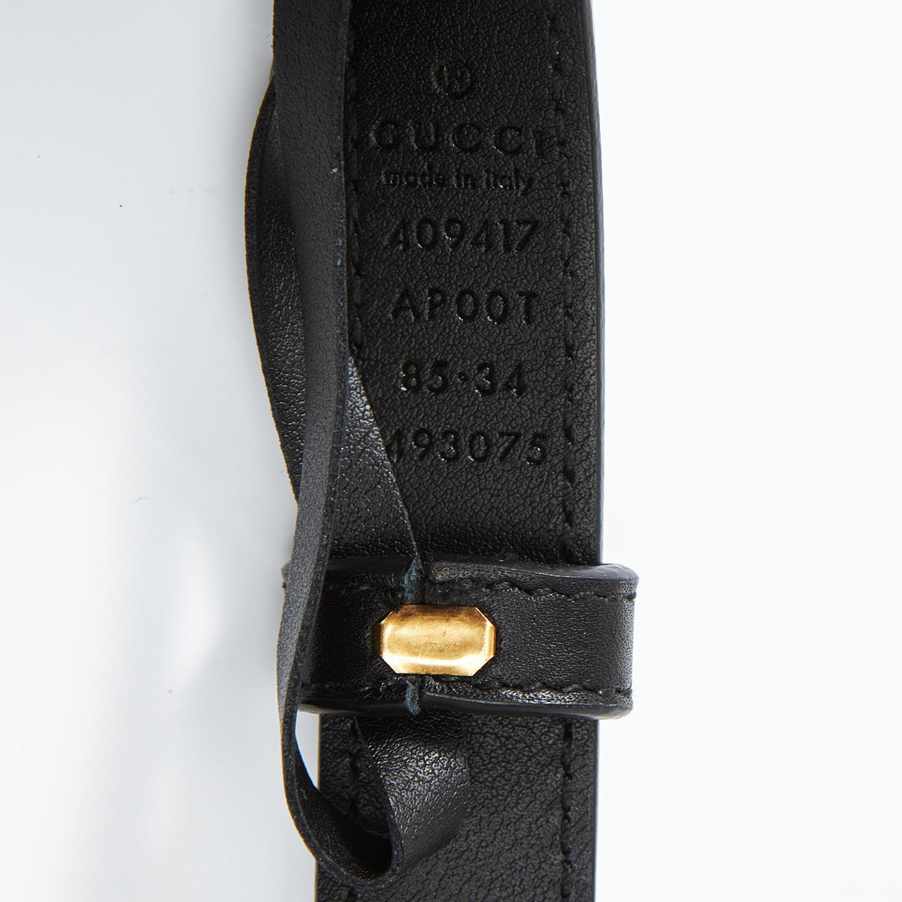 I svart skinn, spänne fram med GG i gulmetall, märkt "Gucci made in Italy", storlek 85, spännets höjd ca 3.5, total längd 99cm.