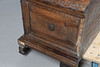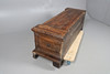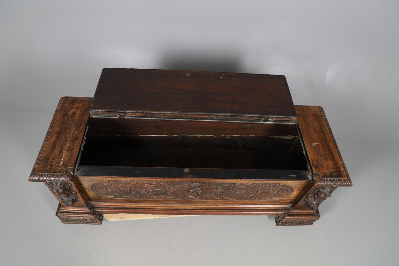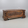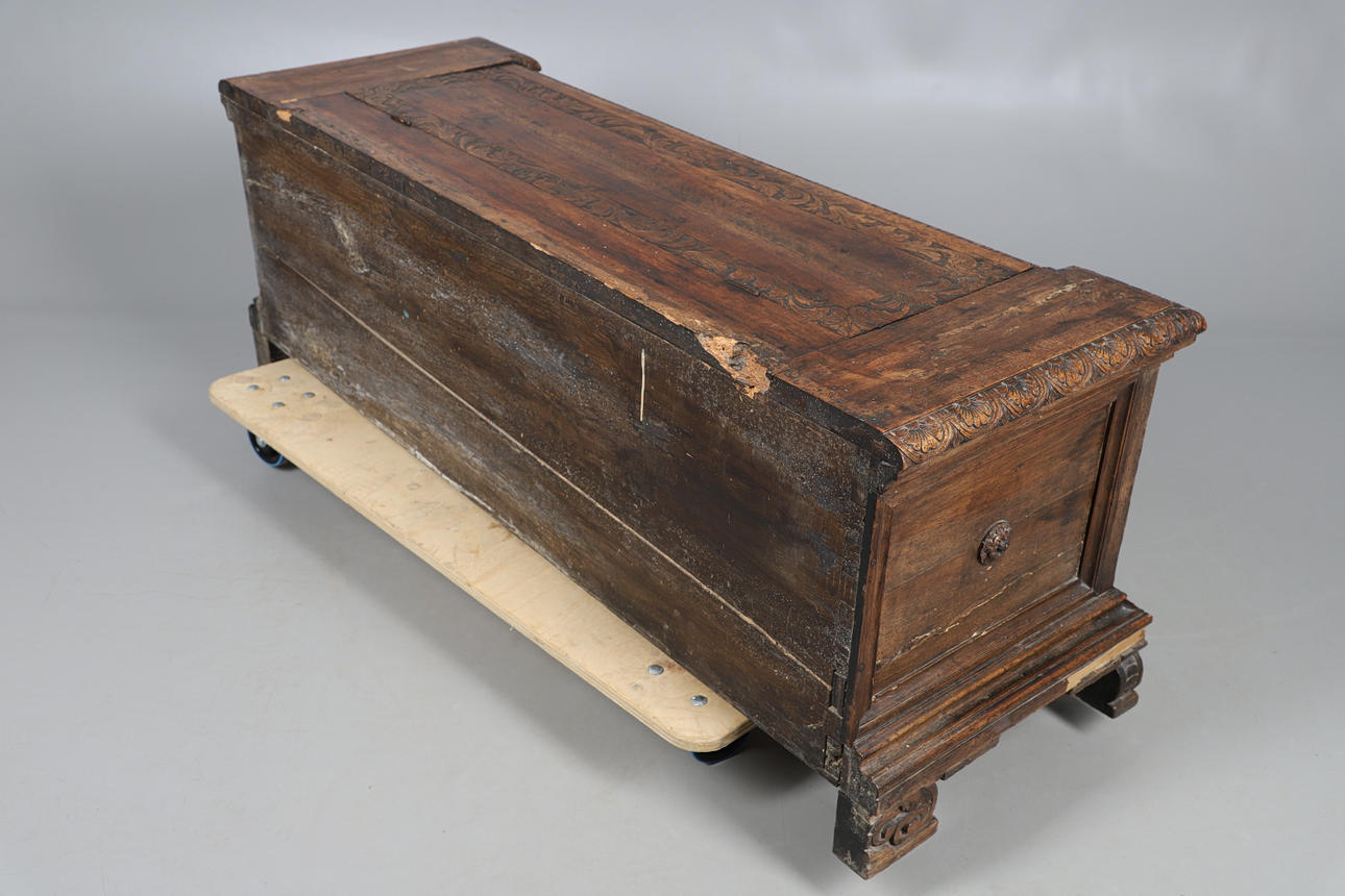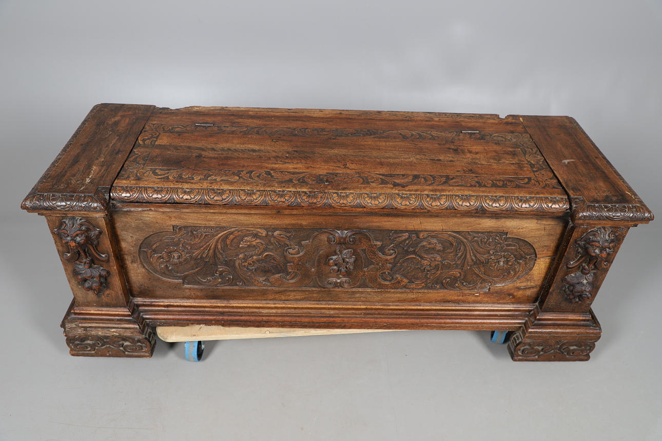 med helskuren mask och bladdekoration, det gångjärnsförsedda locket öppnar för att avslöja en ledig interiör, cirka 158 cm x 53 cm x 56 cm hög.