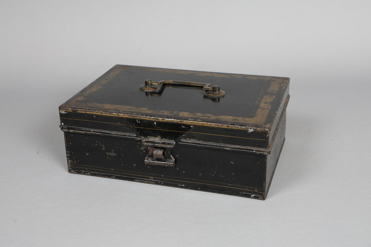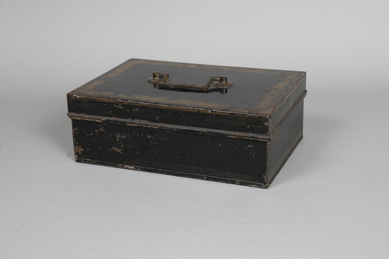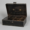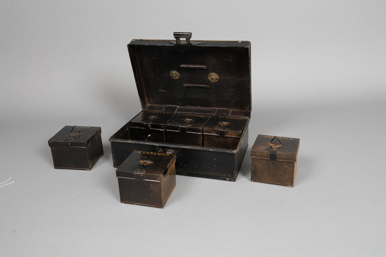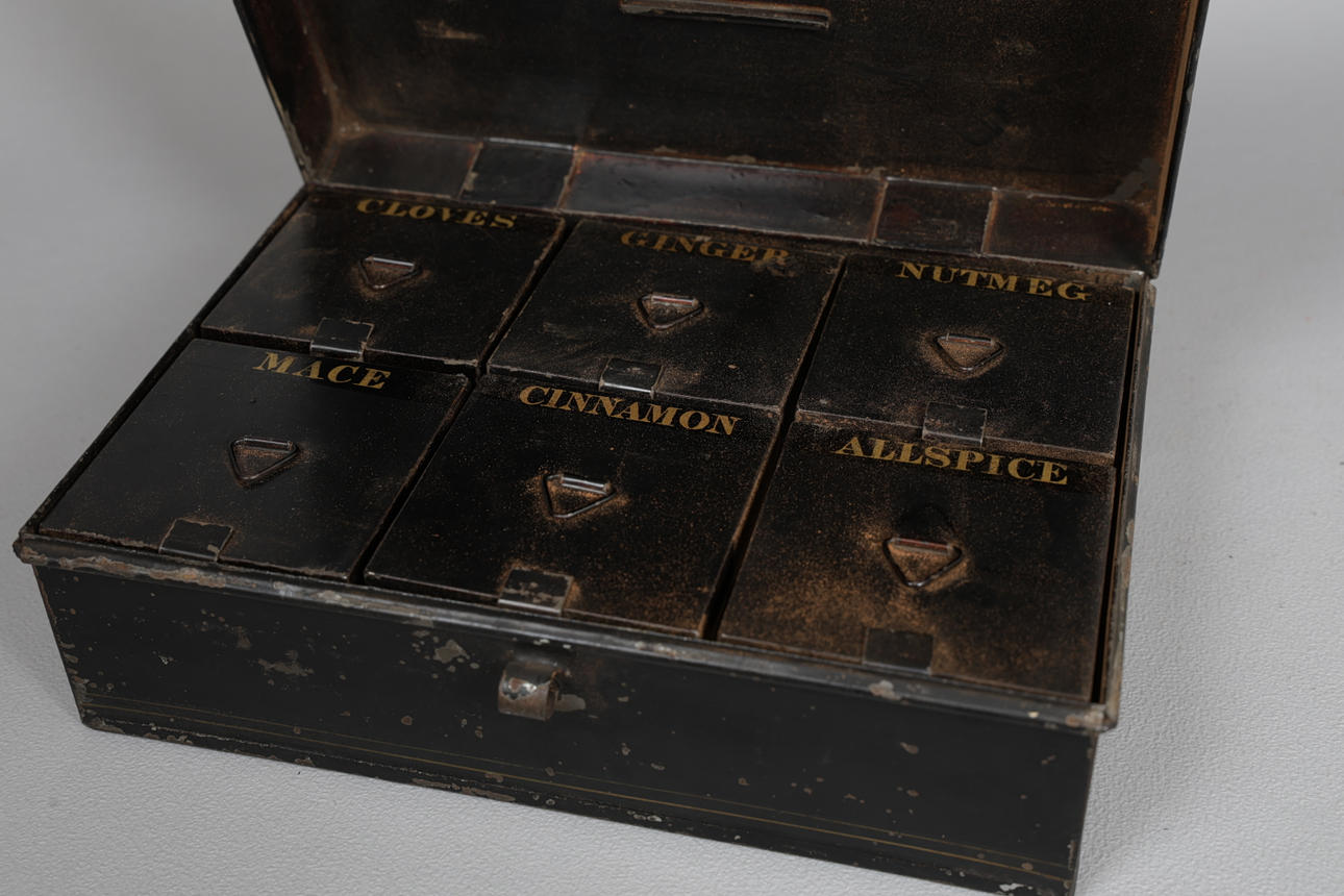 Den gångjärnsförsedda toppen som omsluter sex originalförpackningar för kryddor, var och en individuellt namngiven, 23,5 cm bred, 16 cm djup.