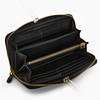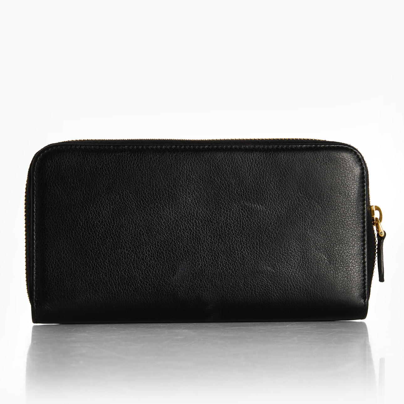 Större plånbok i läder. Stängning med dragkedja, tre större fack, 12 kortfack, en ficka med dragkedja.