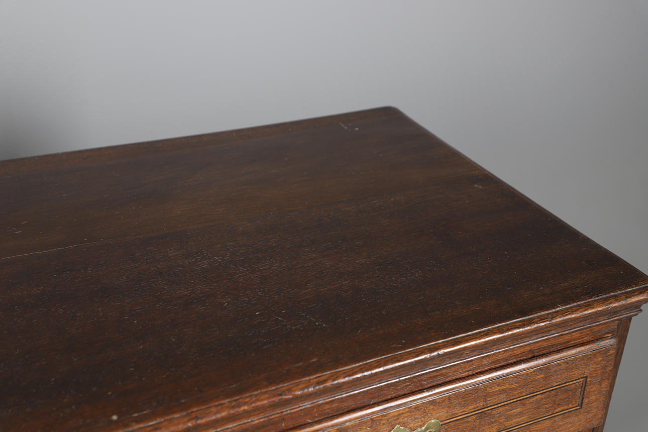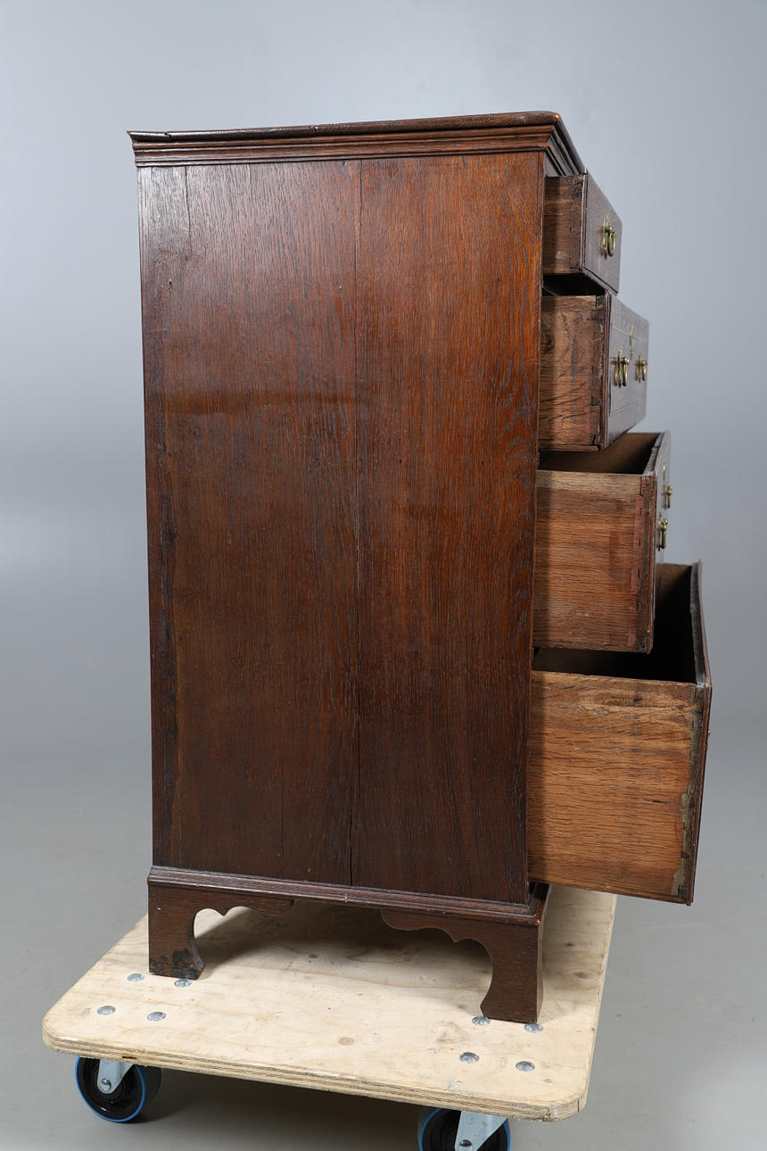 Med två korta lådor över tre långa graderade lådor, alla med mässingsdrag och låsmekanismer (ingen nyckel), stod på konsolfötter. Höjd 96,5cm x Bredd 99cm x Djup 46cm.
