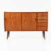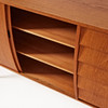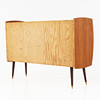 Bukig form, teakfanér, mässingsskodda ben i betsad bok, höjd ca 97,5, 144x45 cm.