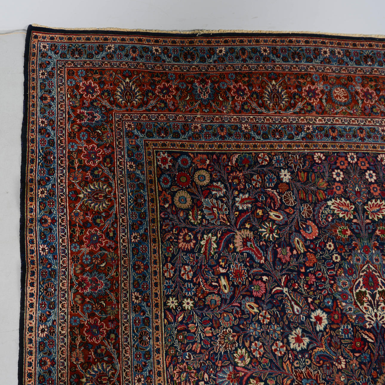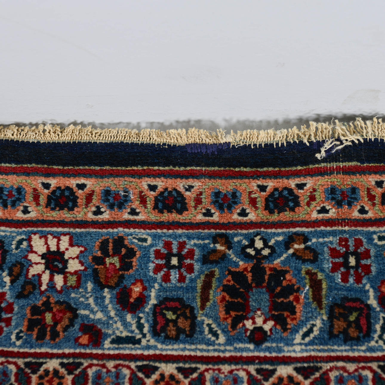 Bruksslitage. Fläckar. Mindre skador på fransrader. Klippta fransar.