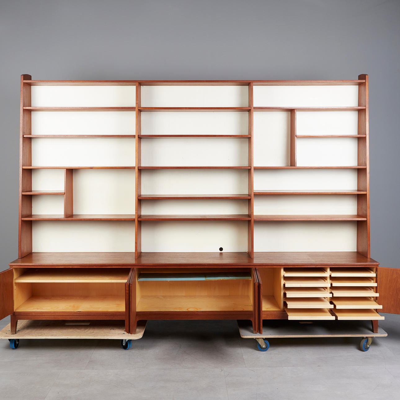 Teakhylla med tre lådor med vikdörrar och en tredelad struktur med 15 hyllor, H.217cm, L.301cm, W.50cm.