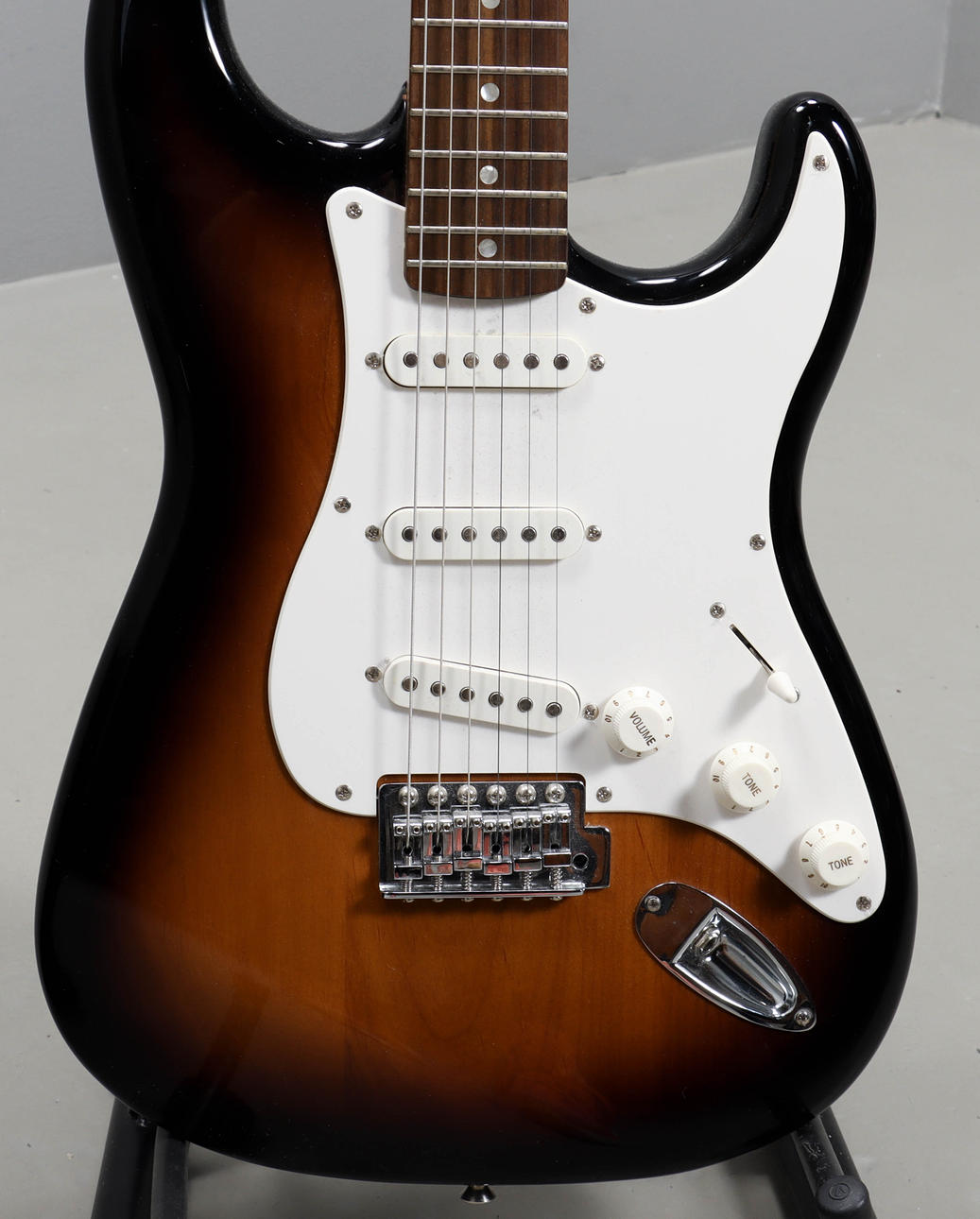 Squier Stratocaster "Affinity Strat" Sunburst med greppbräda i rosewood. Mjukt fodral Warwick Rockbag.