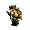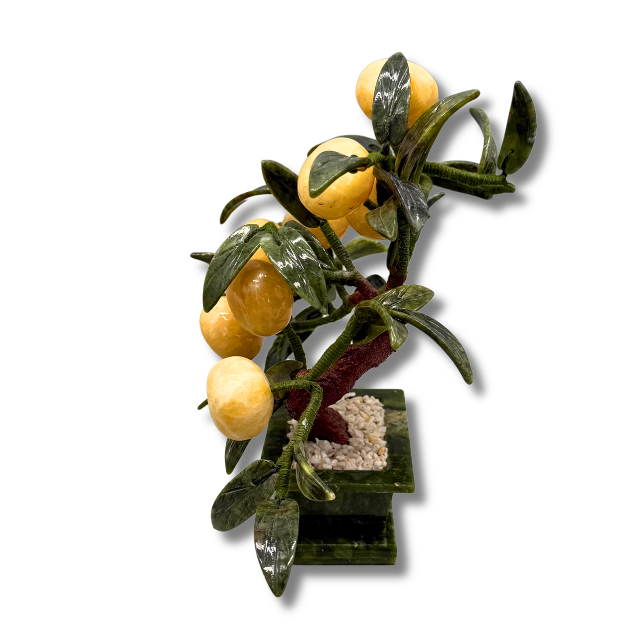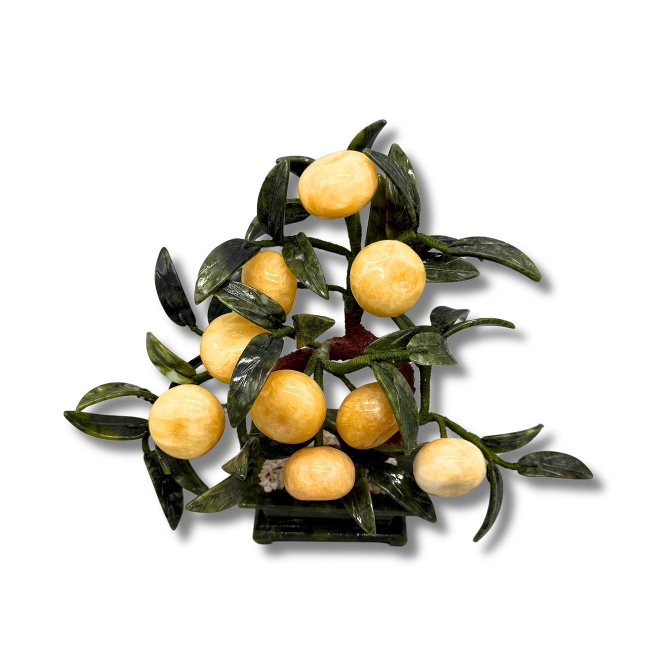 Detta träd visar ett mirabelle- eller bonsaiträd. Bladen och basen är gjorda av grön jadesten, frukterna är gjorda av gul jadesten.