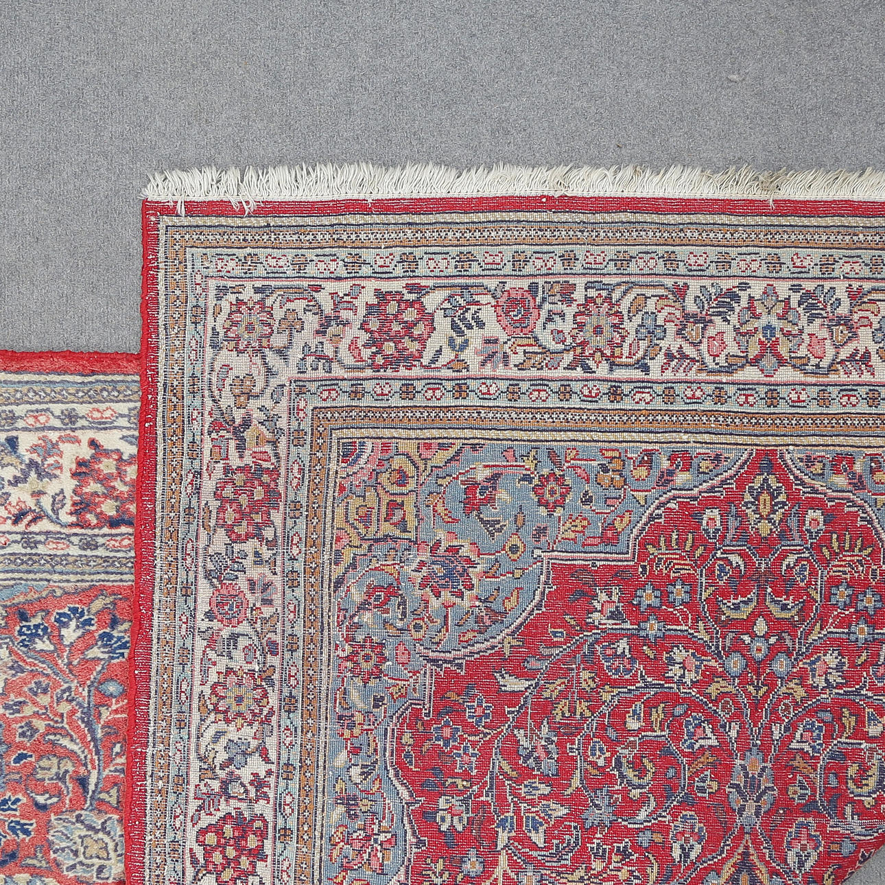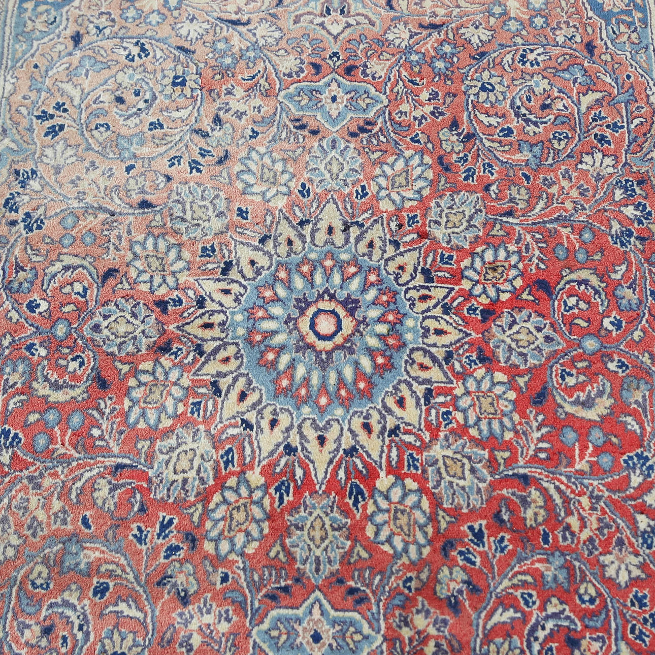 Bruksslitage, solblekt, slitna fransar, smuts.