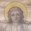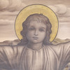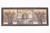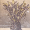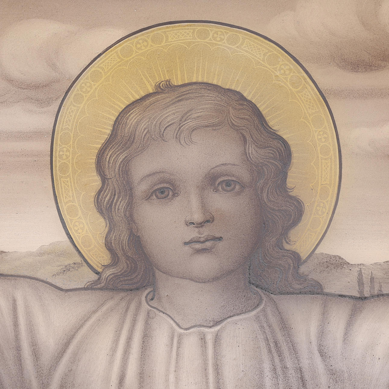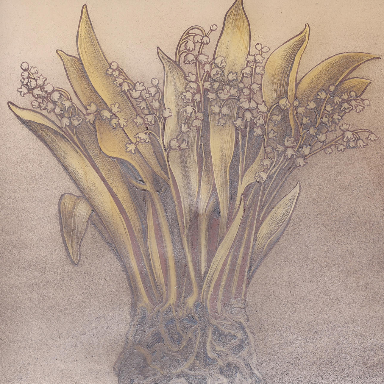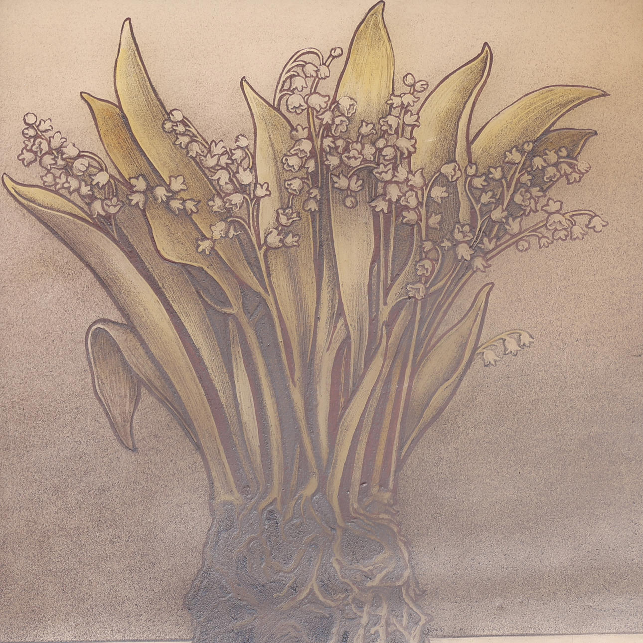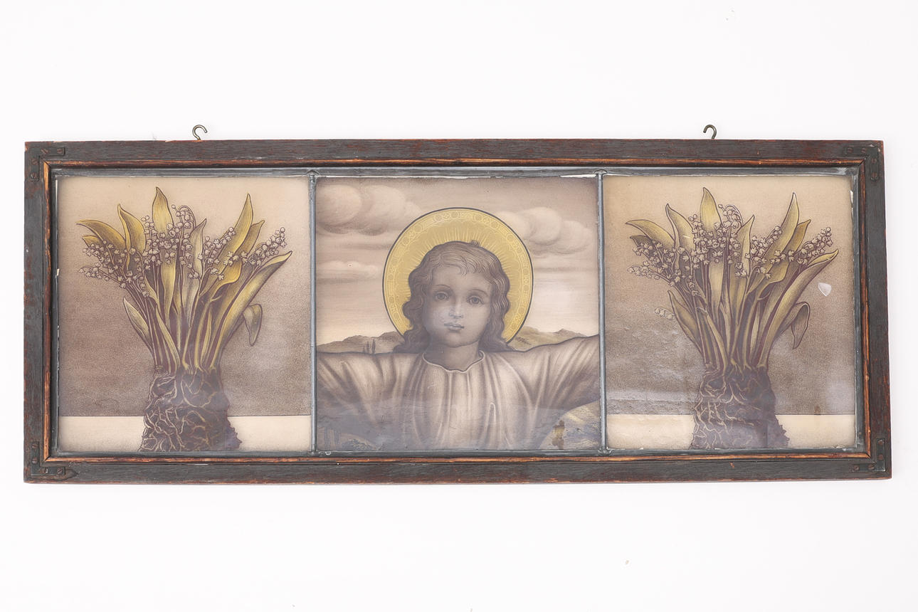 Kristus Emmanuel, utan korsgloria, flankerad av två liljekonvaljer med synliga rotknölar.