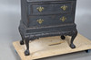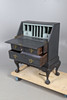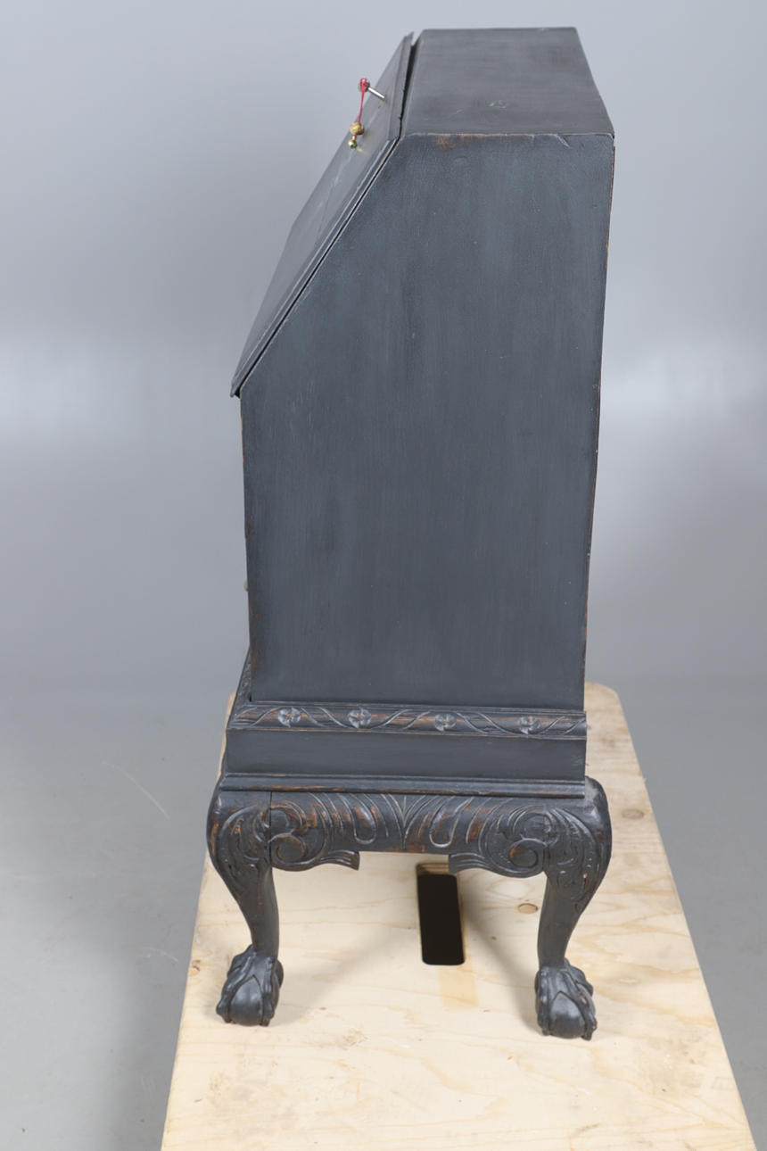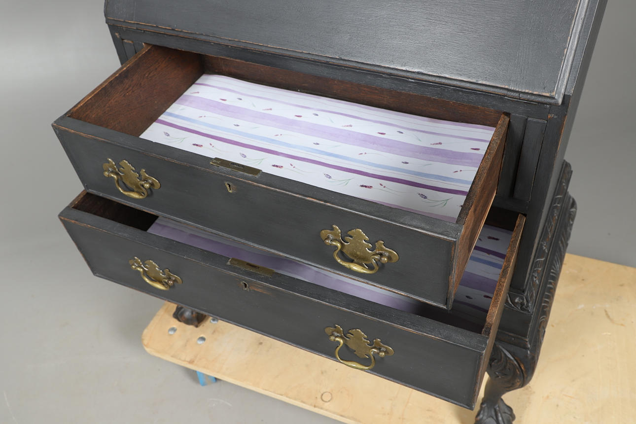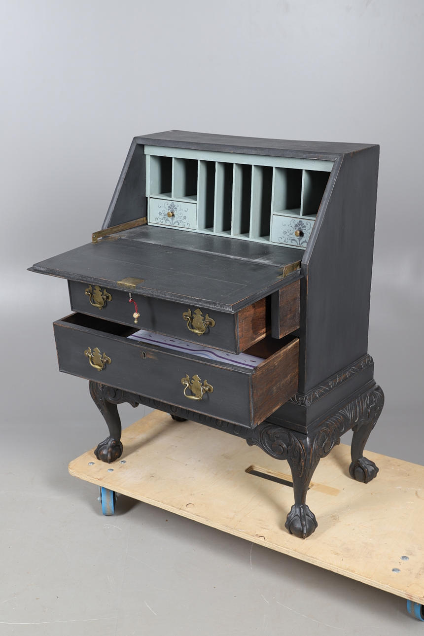 den övre sektionsöppningen för att avslöja duvahål, ovanför två långa lådor, alla upphöjda på boll- och klofötter, 98 cm hög x 69 cm bredd x 42 cm djup.