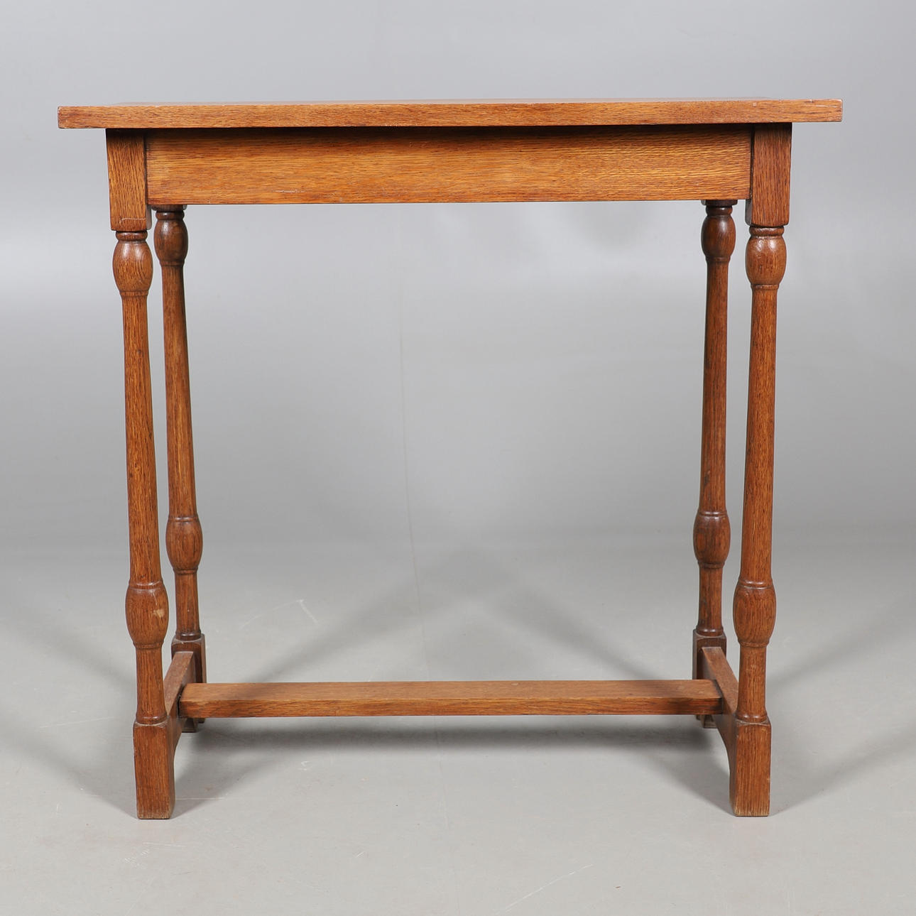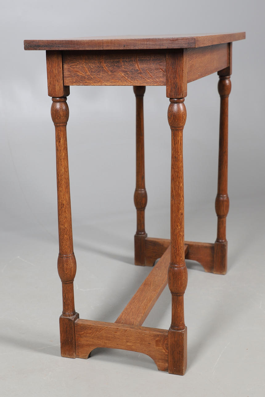 Ett litet sidobord eller hallbord i ek, med en rektangulär formad topp som stöds på smala vända ben. 76 cm hög, topp 76 cm x 37 cm.