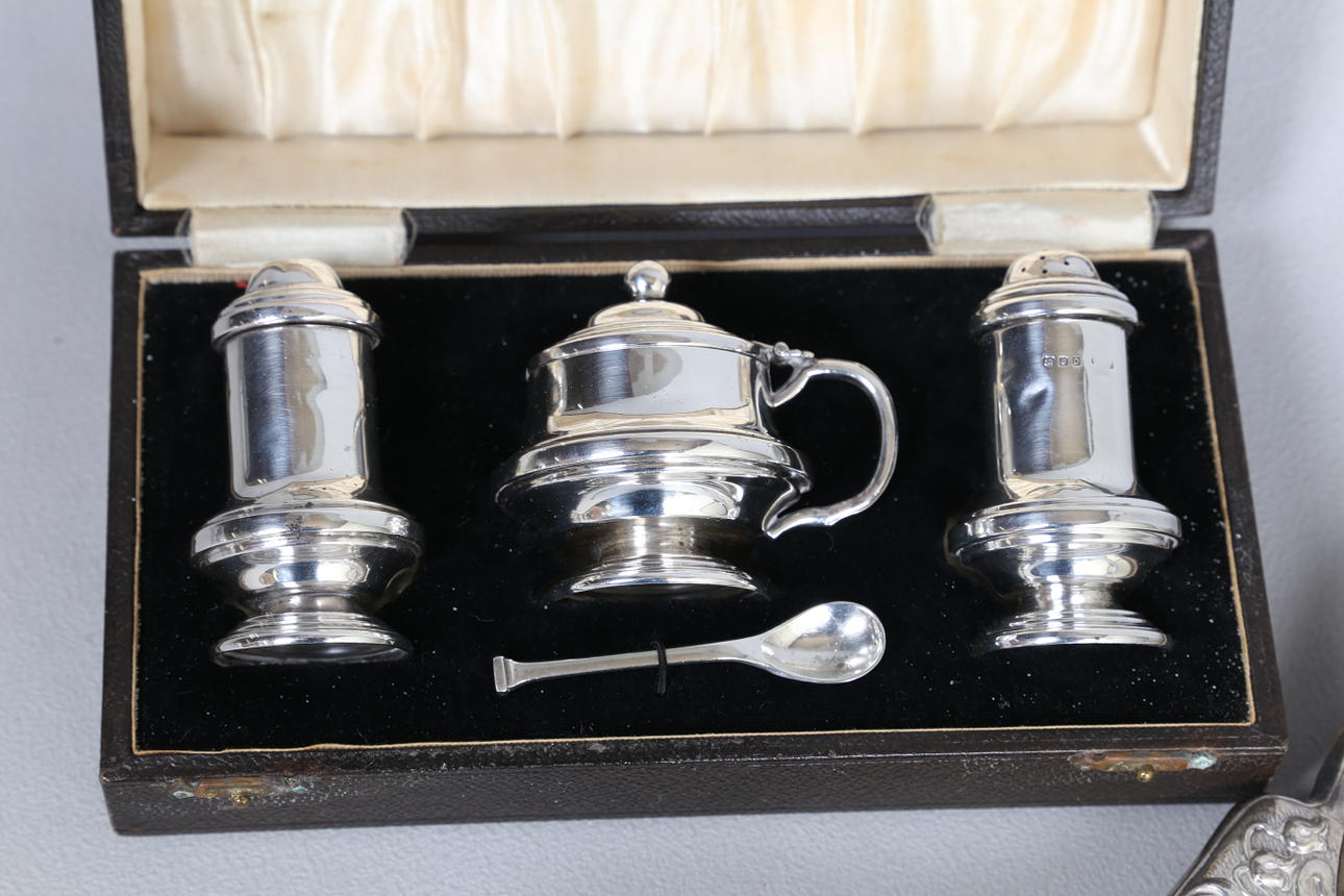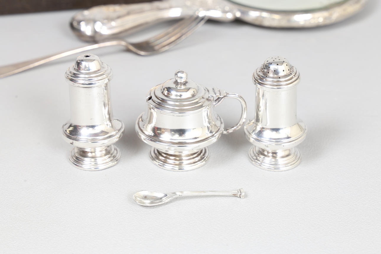 den boxade silverkryddsatsen av Collett & Anderson, London 1939, silvergaffeln London 1832, tillverkarens märke gnuggad, totalvikt 11.3oz (inklusive spegelglas) (6).