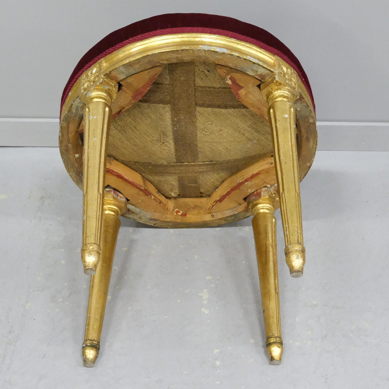 Pall med klädd sits, stomme med förgyllning, höjd 44cm, diameter 45cm.