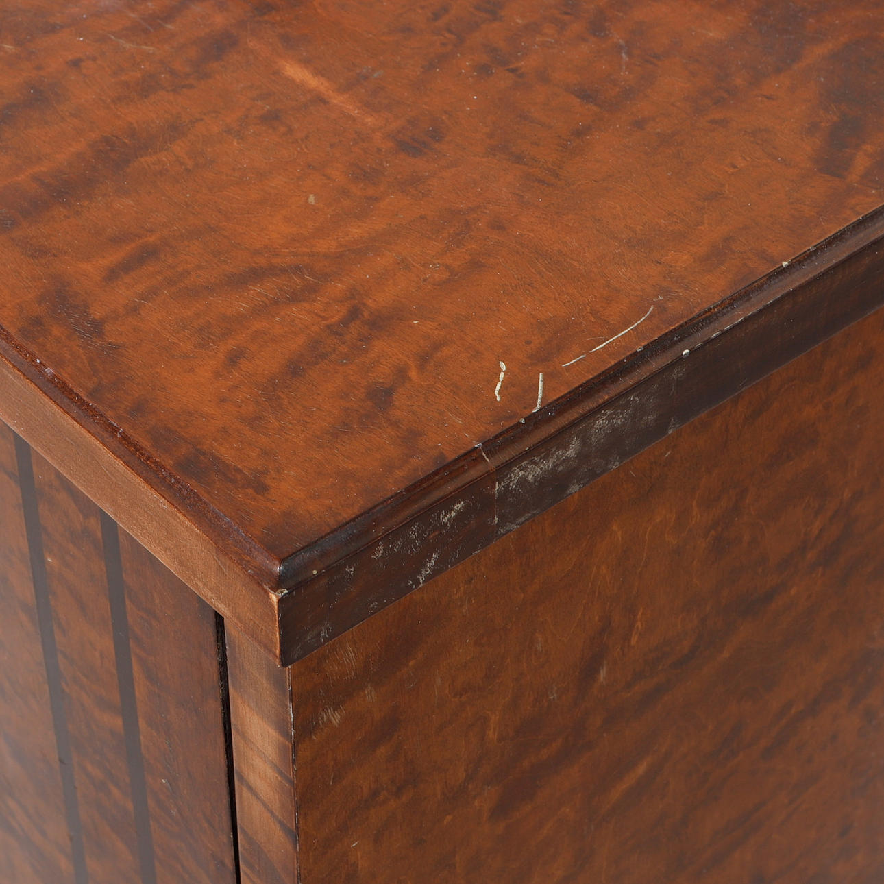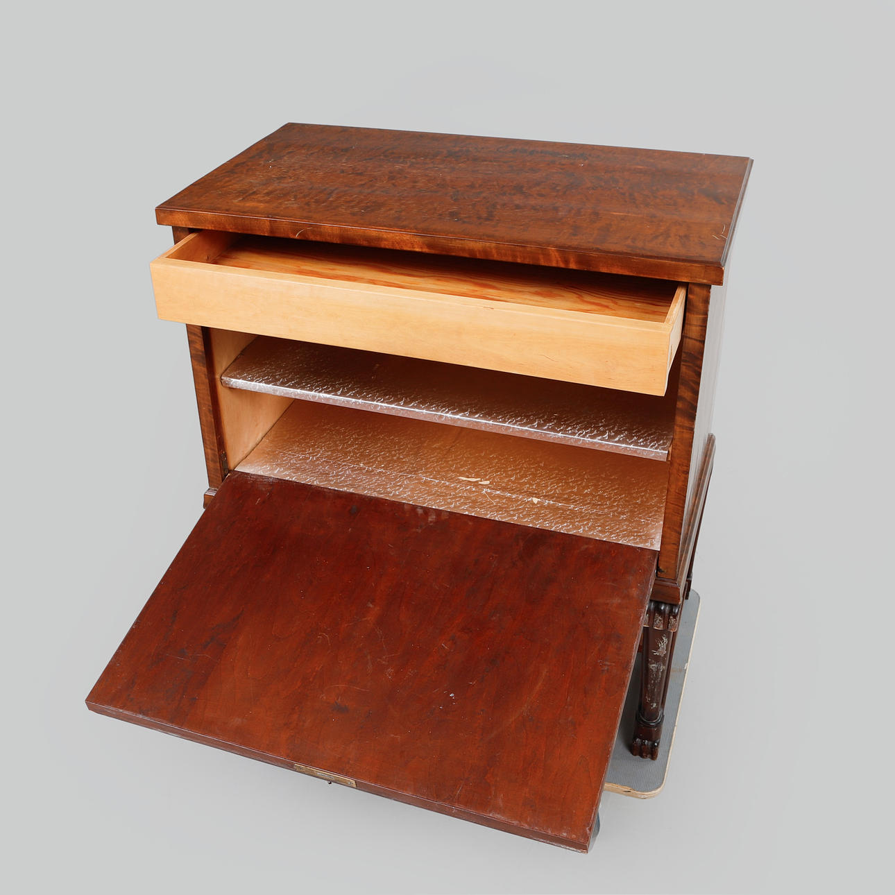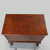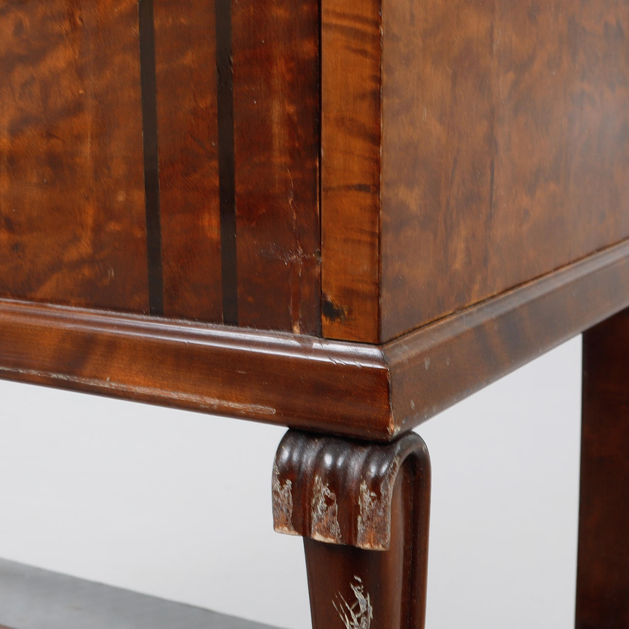Bonad björk med iläggningar. Fällbar skiva med bakomvarande låda samt hyllor. Bredd ca 76 cm, djup ca 42 cm, höjd 82 cm.