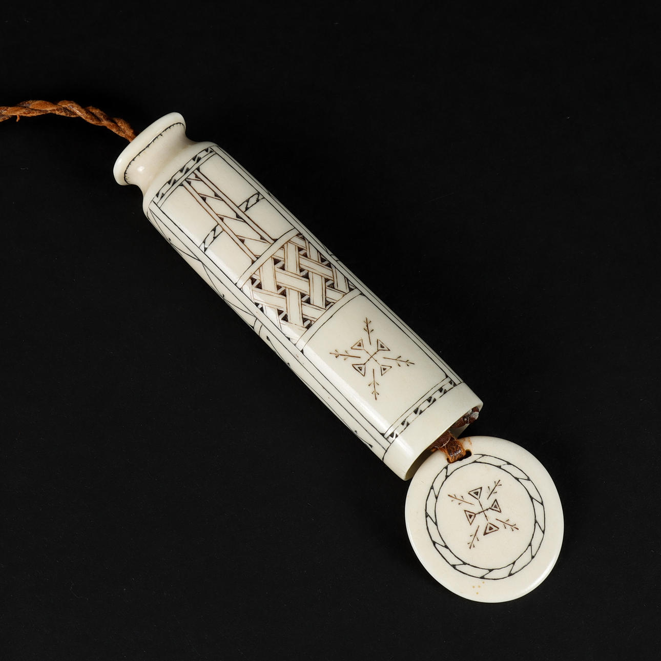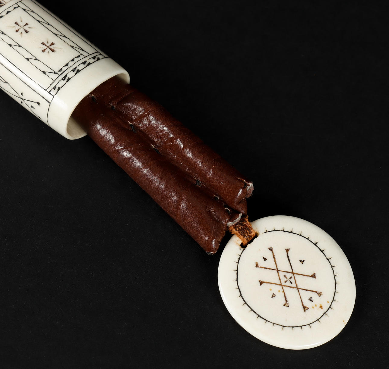 Skuret och infärgat renhorn och skinn. Monogramsignerad "iG".