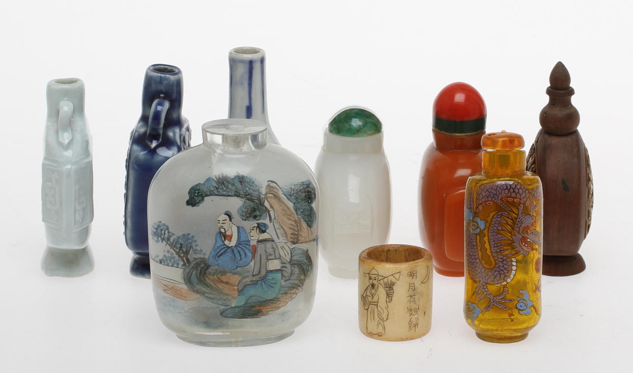 41607. SNUSFLASKOR/FLAKONGER, 8 st, RING, glas & porslin, Kina.
