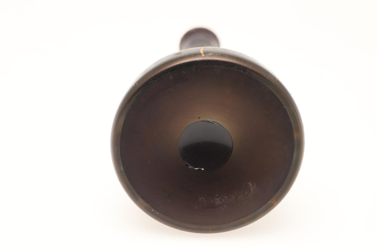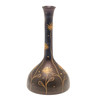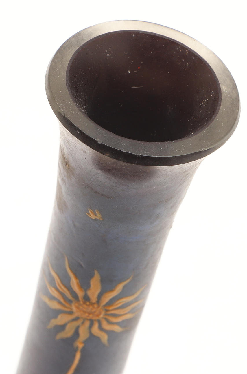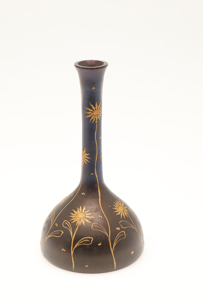 En glasvas med hög smal hals och spridande bas, målad i förgylld med stiliserade solblommor. 19 cm hög.