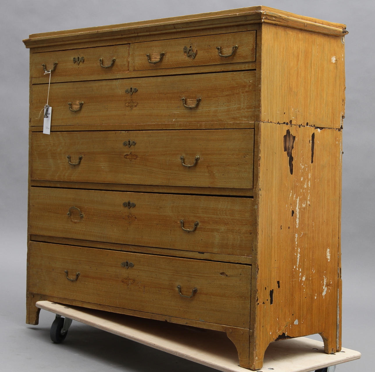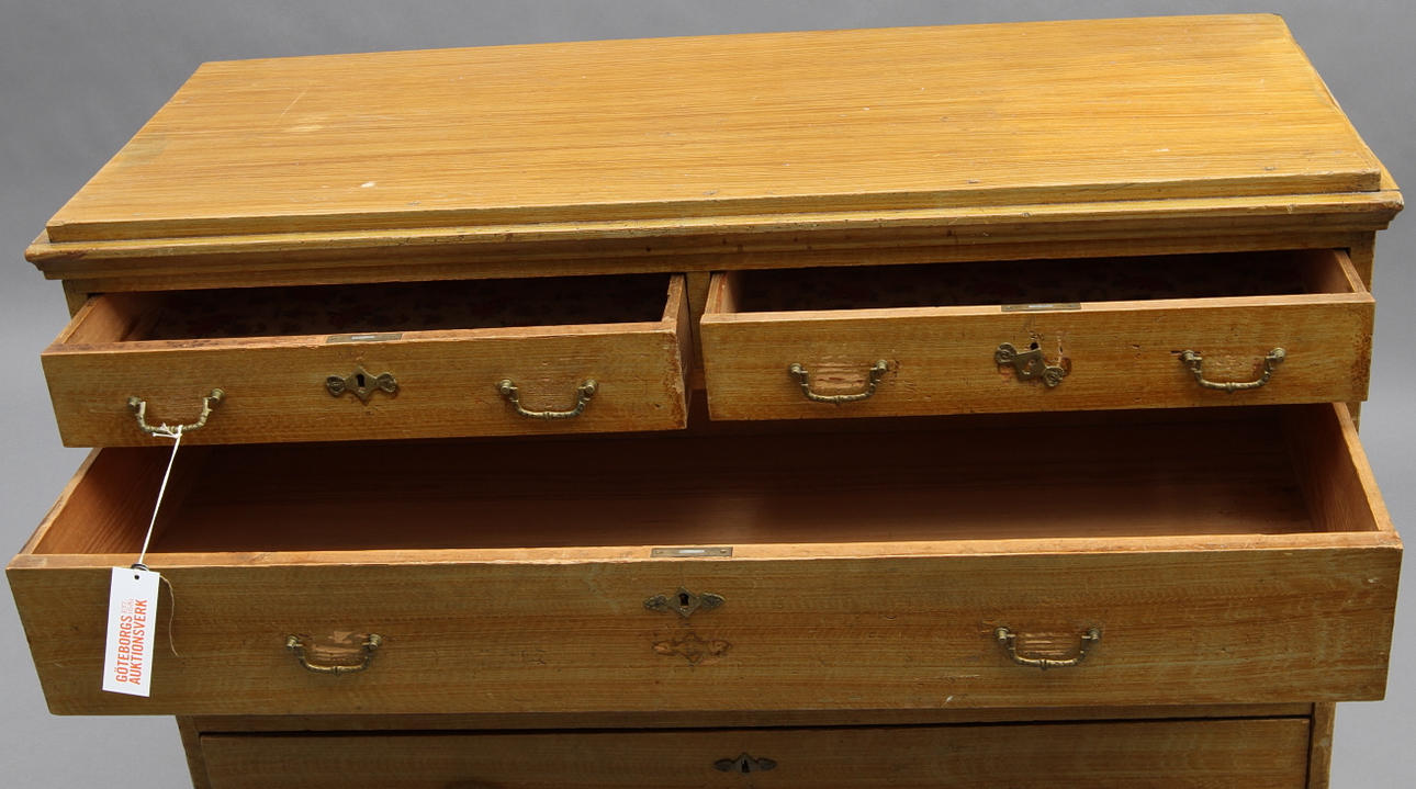 Bemålat trä med 6 lådor. Längd 130, bredd 50, höjd 113 cm.