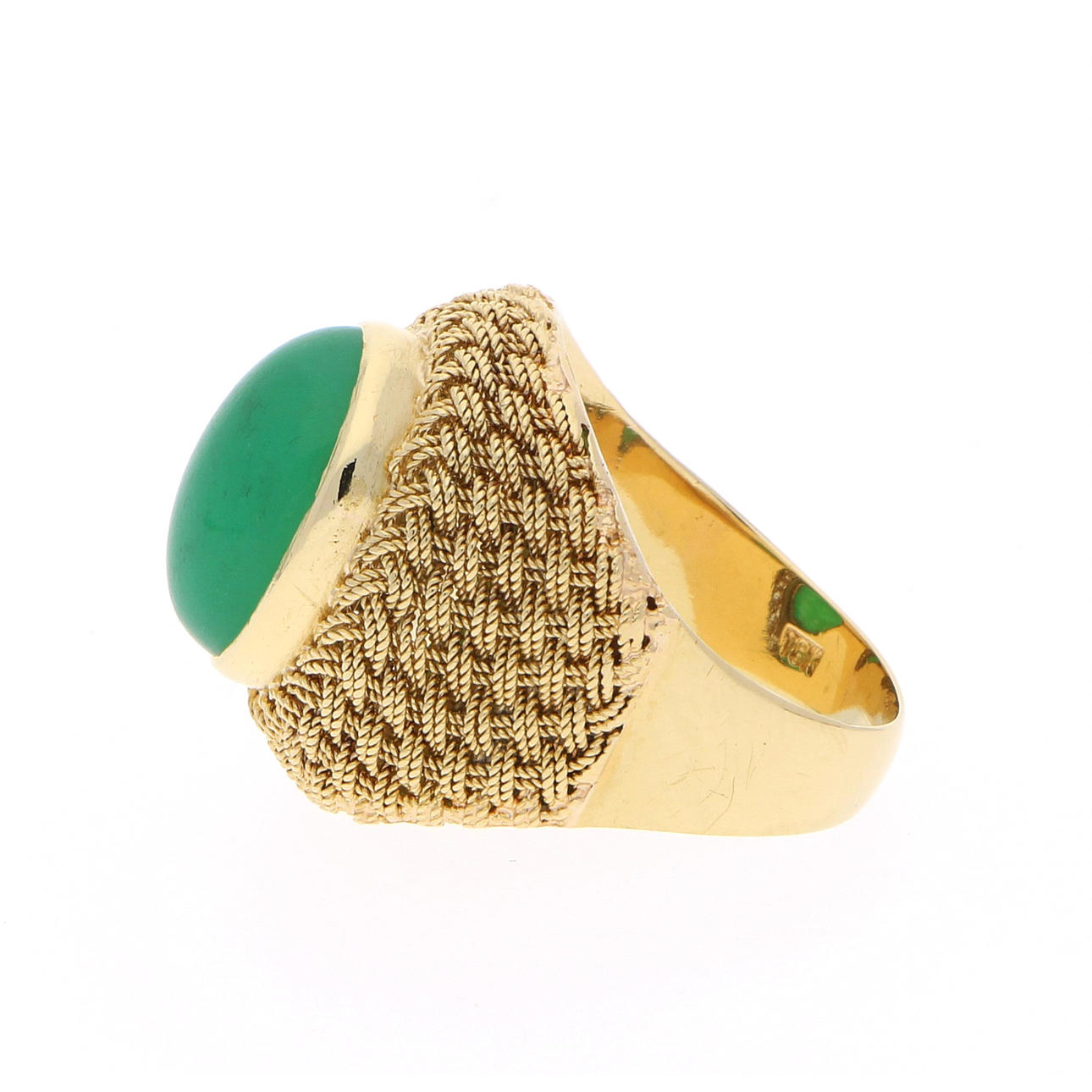 Den gröna stenen är förmodligen en grön jade, ringbredd 56, totalvikt 9 g.