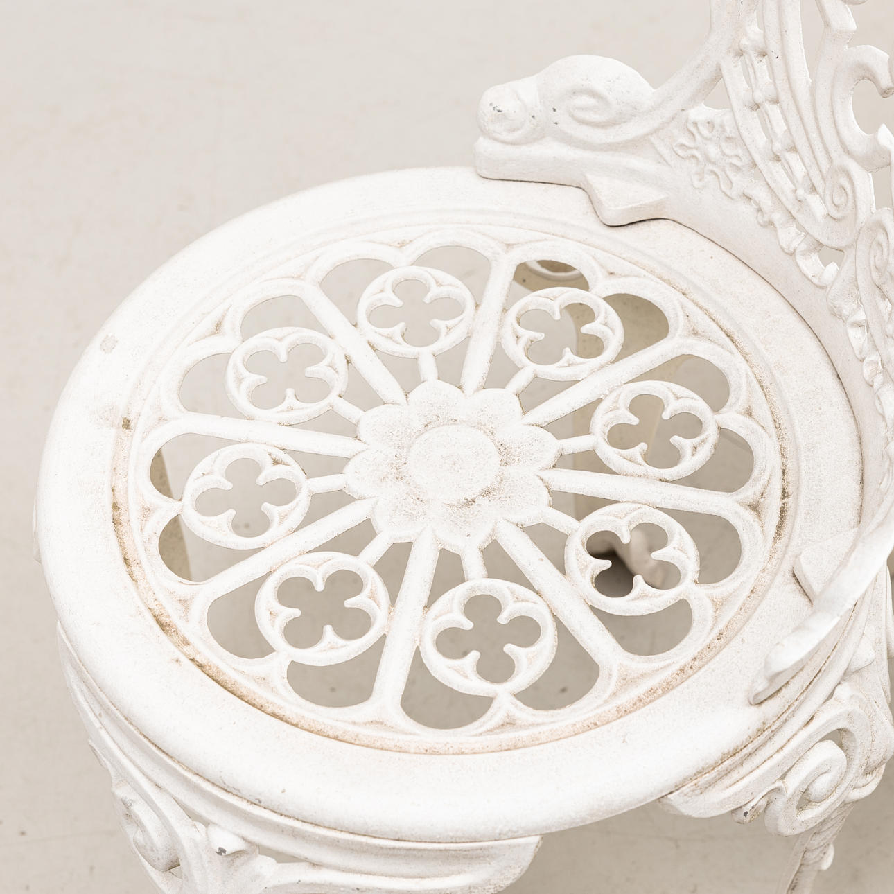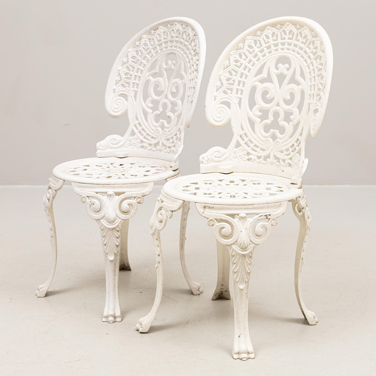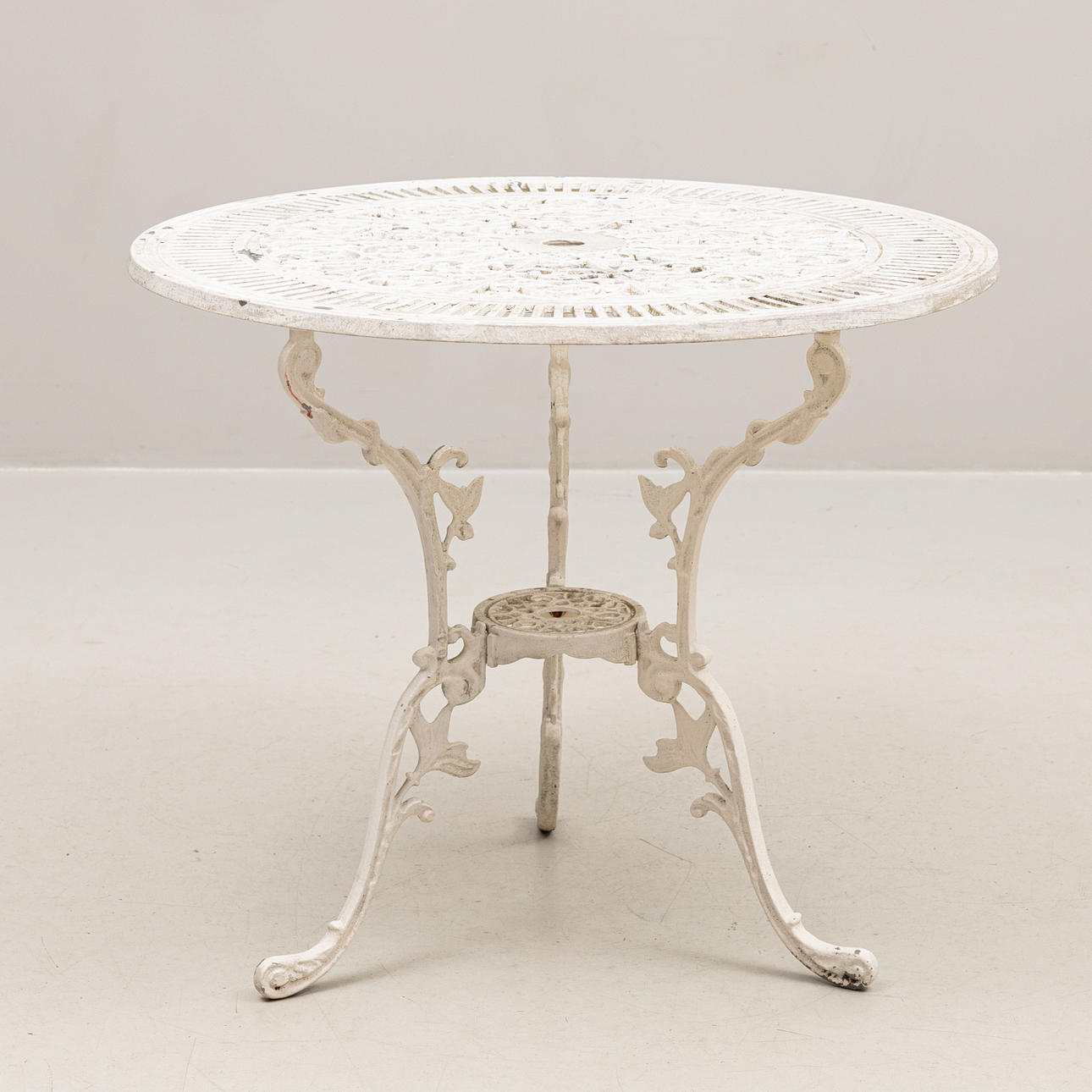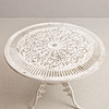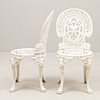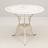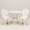 Bord, diameter ca 80, höjd 68 cm. 2 stolar, sitthöjd 41, rygghöjd 86 cm.