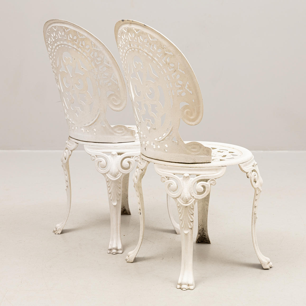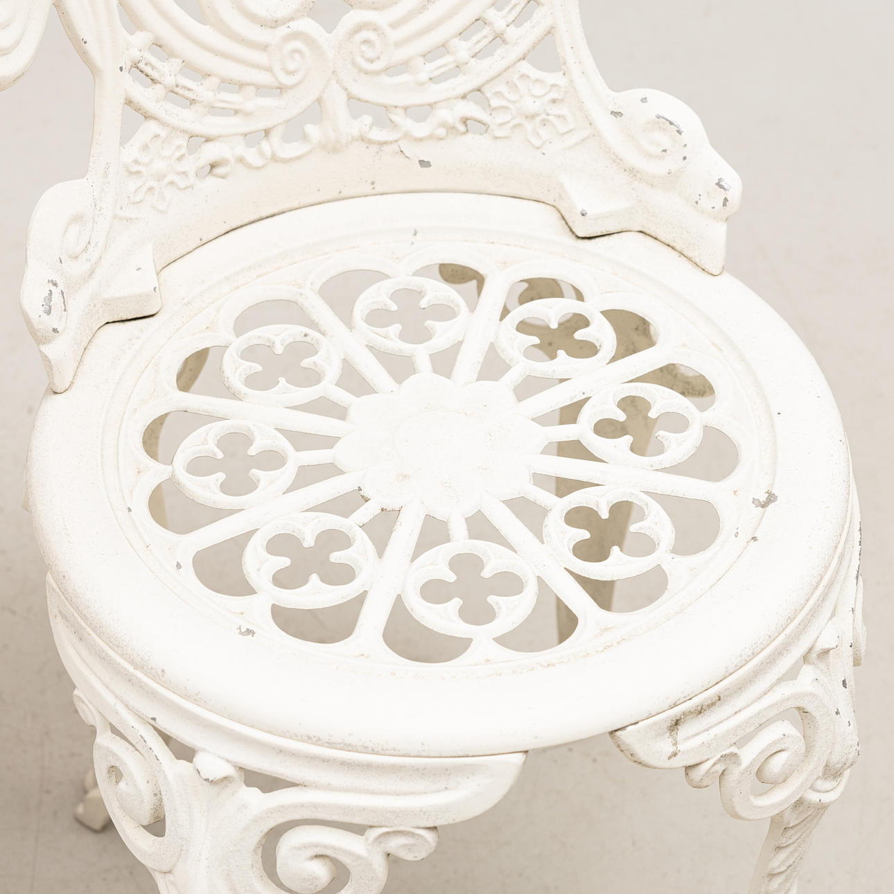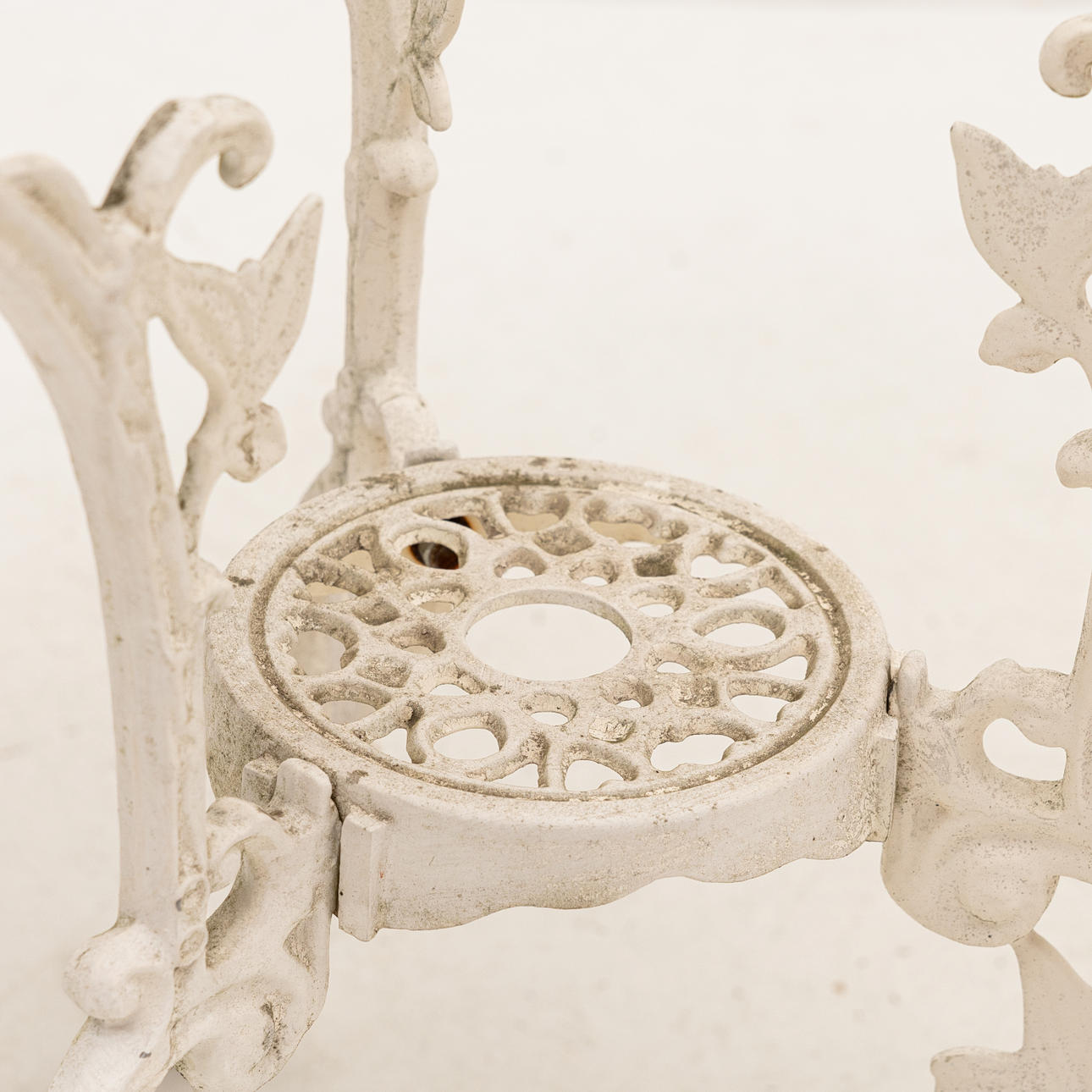 Bord, diameter ca 80, höjd 68 cm. 2 stolar, sitthöjd 41, rygghöjd 86 cm.